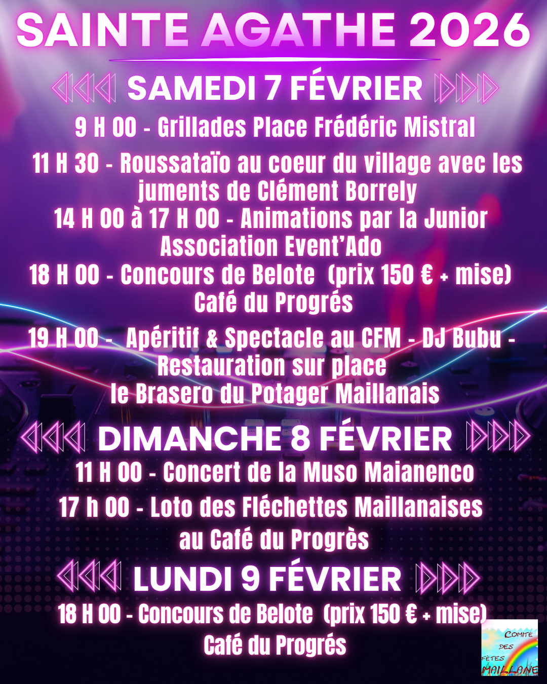 La fête de Sainte-Agathe se situe début février. Elle était la fête patronale du village avant d’être détrônée par la fête de Saint-Eloi.