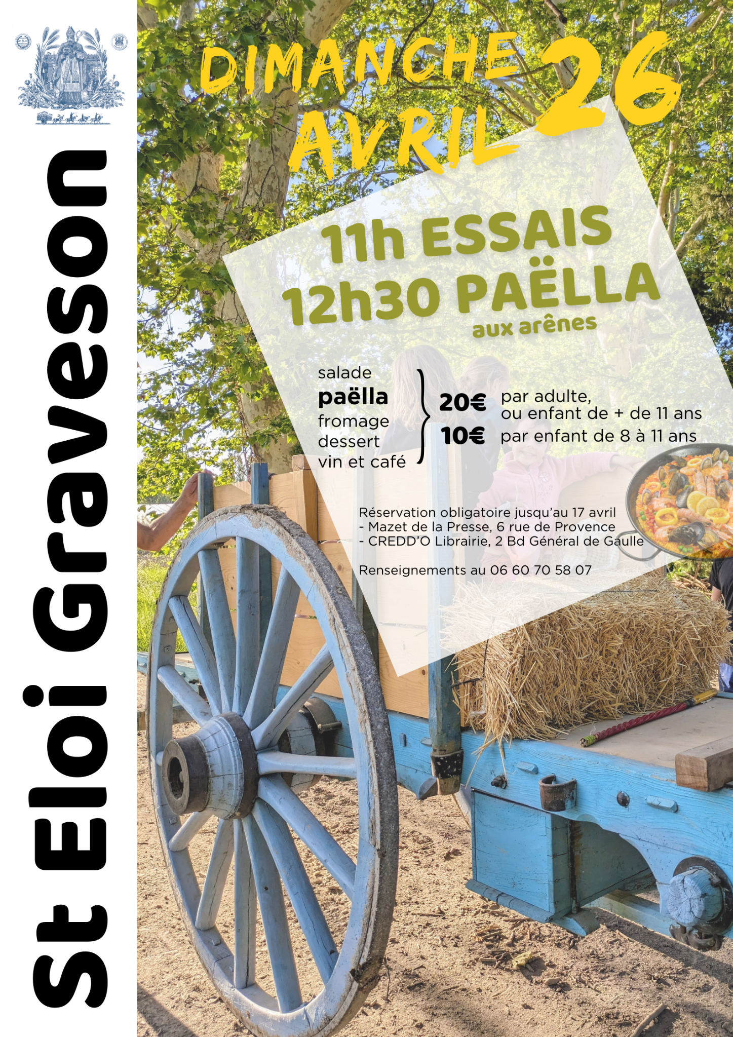 C’est le dimanche 26 avril à 11h00 qu’aura lieu les essaie de la Charrette, suivi d’une paëlla dans les arènes de Graveson à 12h30, organisés par la Confrérie de St. Éloi.