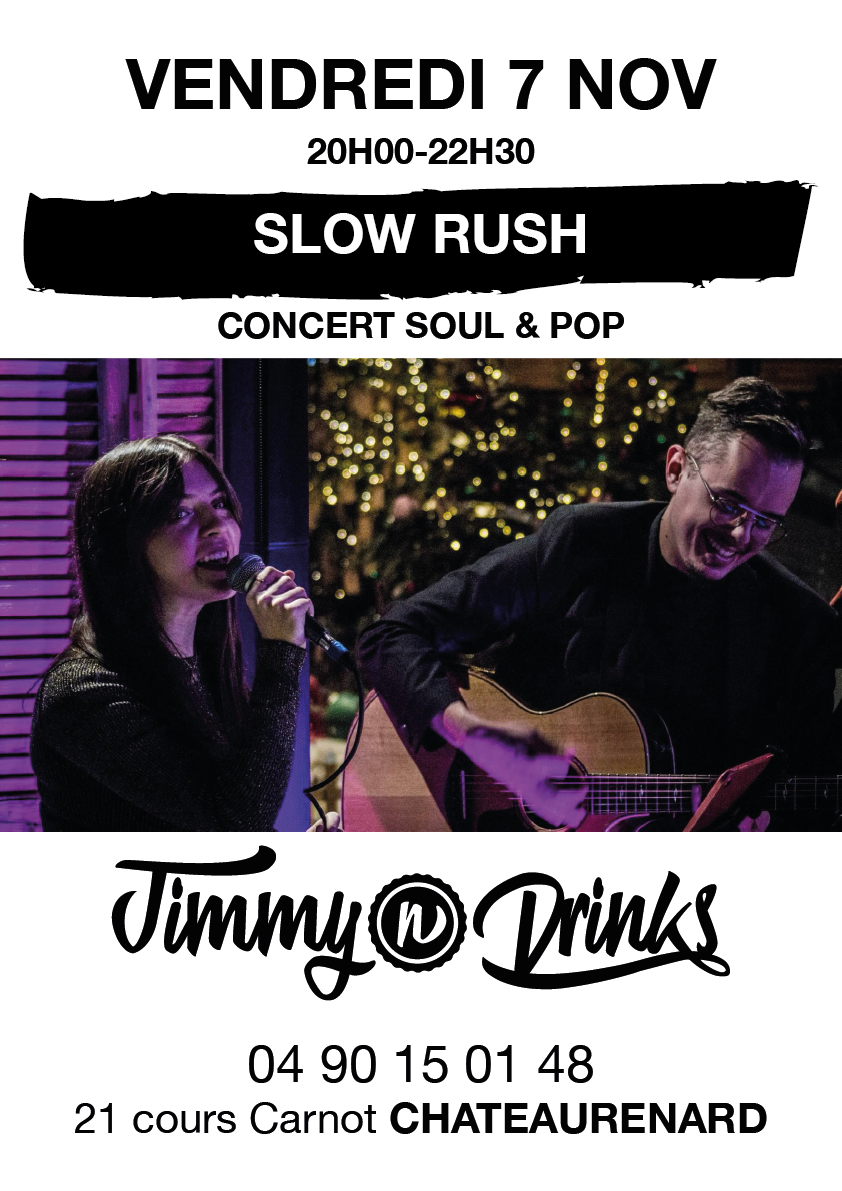 Concert "Slow Rush" chez Jimmy n Drinks Venez assister au concert de "Slow Rush" chez Jimmy n Drinks tout en buvant un verre, dégustant un plat... Concert duo Soul & Pop. Langues Français Ouverture Vendredi 7 novembre 2025 de 20h à 23h. Tarifs Accès libre. Coordonnées Jimmy n Drinks 21 Cours Carnot 13160 Châteaurenard 04 90 15 01 48 contact@jimmyndrinks.fr https://www.facebook.com/jimmyndrinks