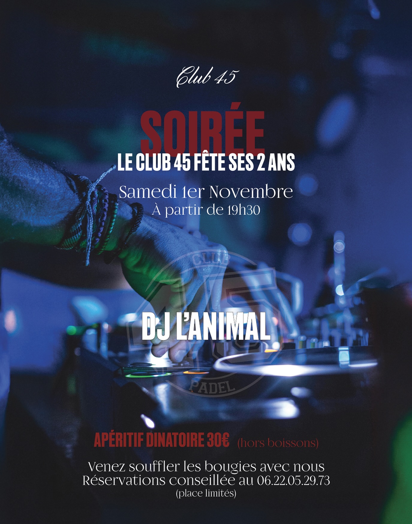 Le Club 45 Padel est en fête ! Venez célébrer les deux ans de votre club lors d’une soirée exceptionnelle, placée sous le signe de la convivialité et de la bonne musique.