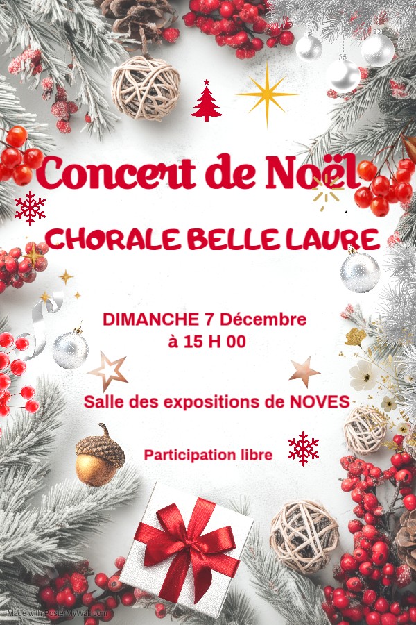 Concert de Noël de la Chorale Belle Laure Concert de Noël de la Chorale Belle Laure Langues Français Ouverture Dimanche 7 décembre 2025 à partir de 15h. Tarifs Participation libre. Coordonnées Salle des Expositions Boulevard de la République 13550 Noves 06 81 12 31 86 danielle.latil@orange.fr