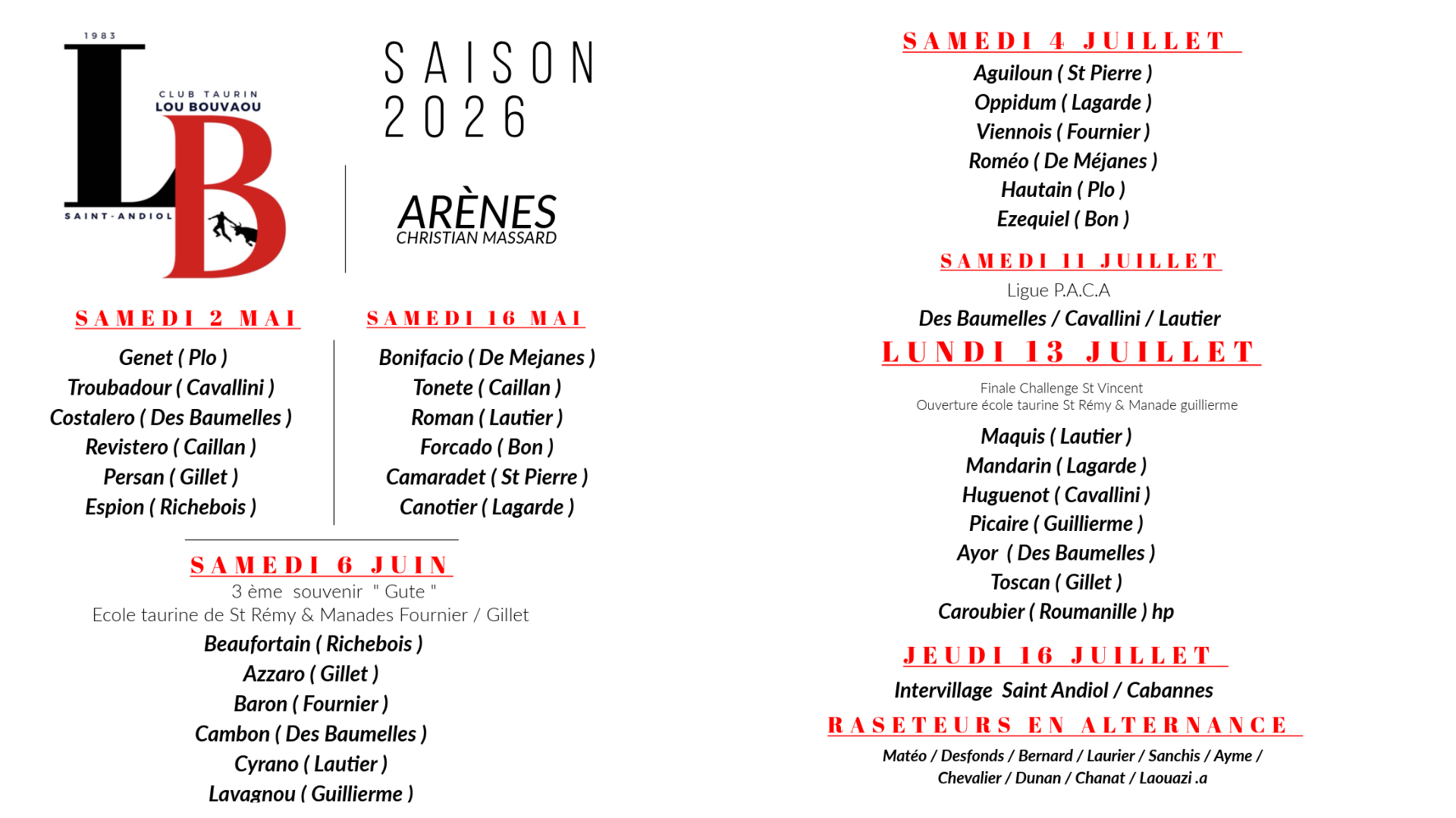 Saison 2026 du Club Taurin Lou Bouvaou A partir du 2 et 16 mai Langues Français Ouverture Samedi 2 mai 2026. Samedi 16 mai 2026. Tarifs Accès libre. Coordonnées Arènes municipales Christian Massard Parc du Château 13670 Saint-Andiol