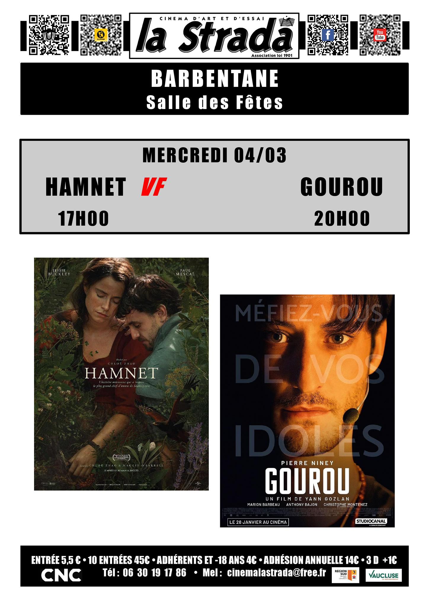 Plein tarif : 5,50 €, Tarif réduit : 4 € (Adhérents et - de 18 ans).