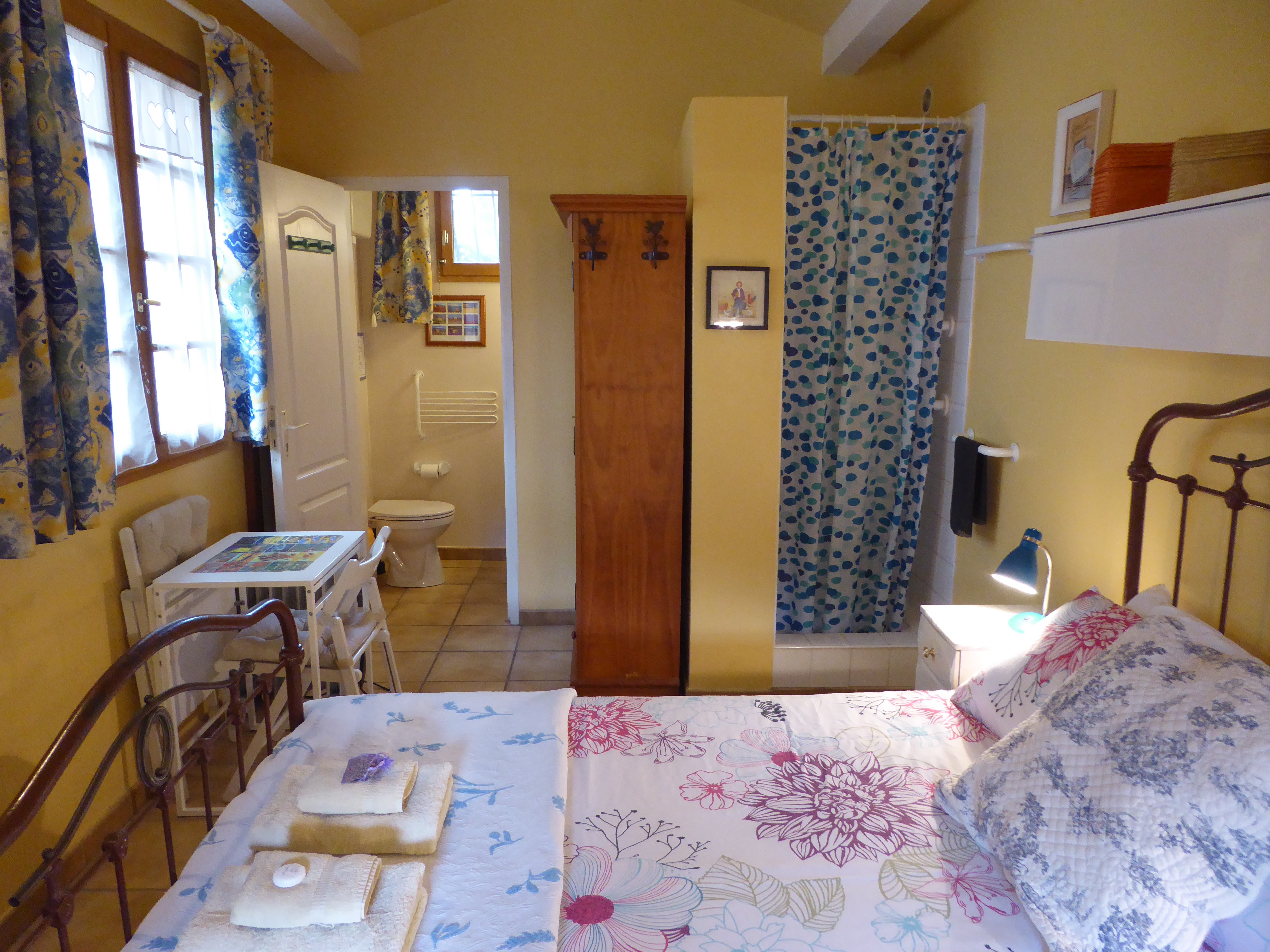 Chalet indépendant de 17m2, idéal pour petits budgets. Pièce principale avec lit en fer forgé antique, kitchenette Sélection de livres. Salle d’eau avec douche, WC et vasque séparés. Piscine et jardin à partager avec les autres meublés.