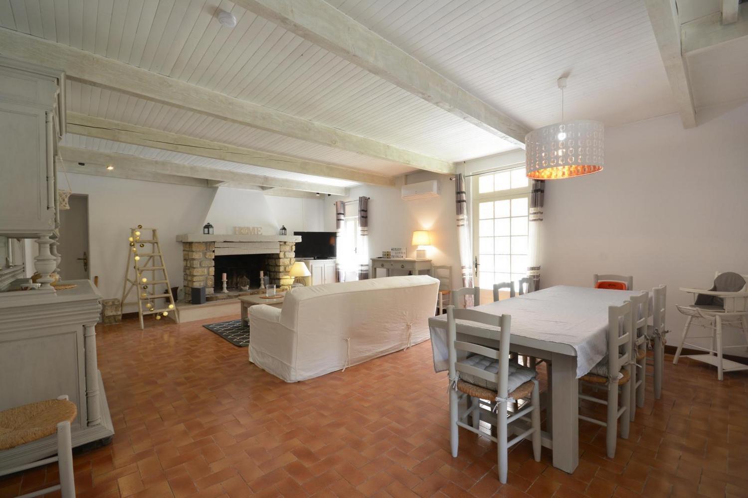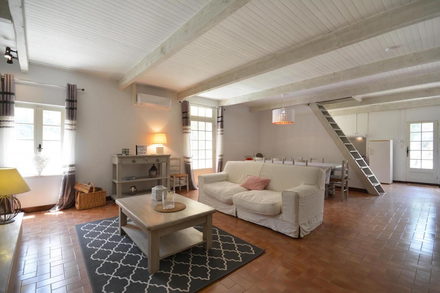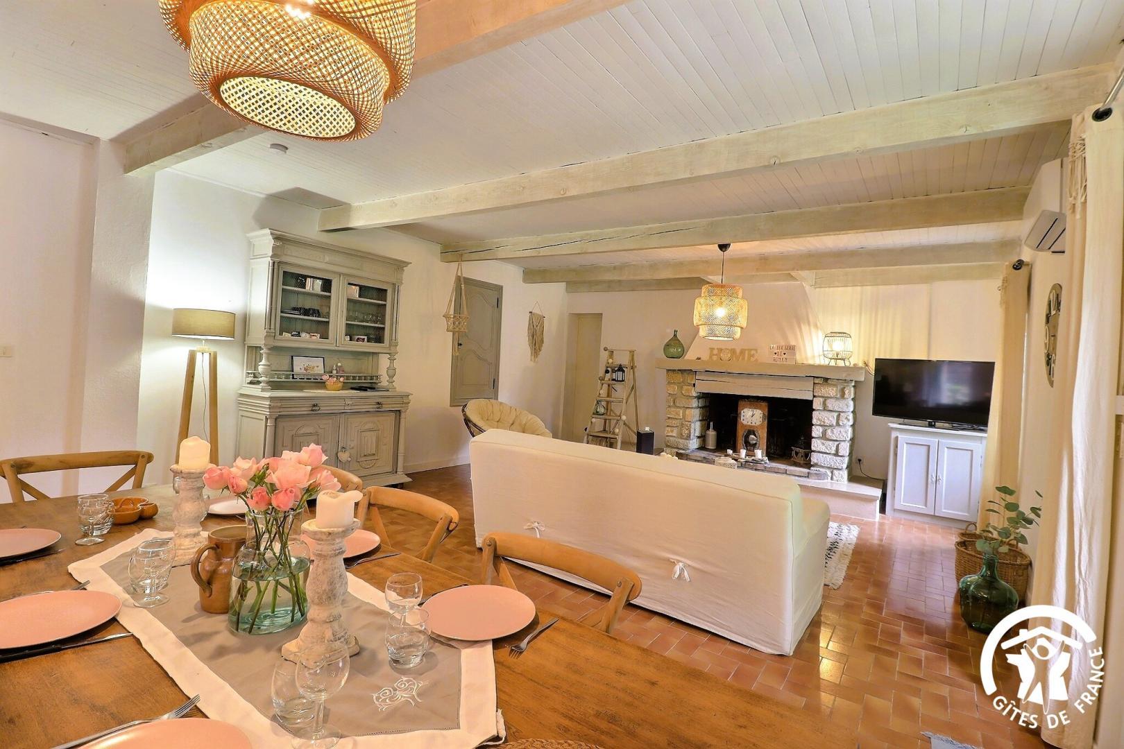 – Salon / salle à manger avec cheminée décorative, canapé, fauteuil, TV écran plat, chaîne hifi et bibliothèque. Espace repas. Climatisation réversible
