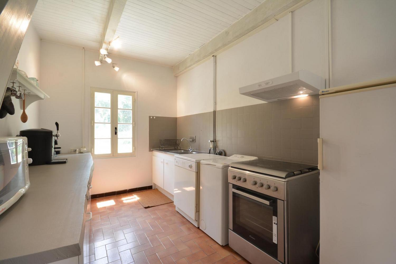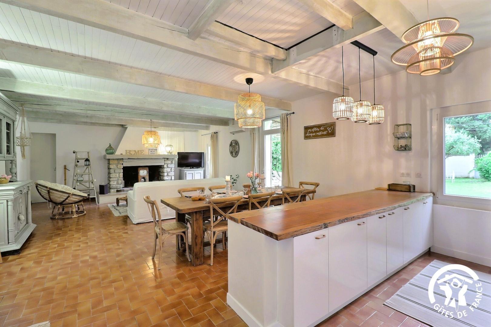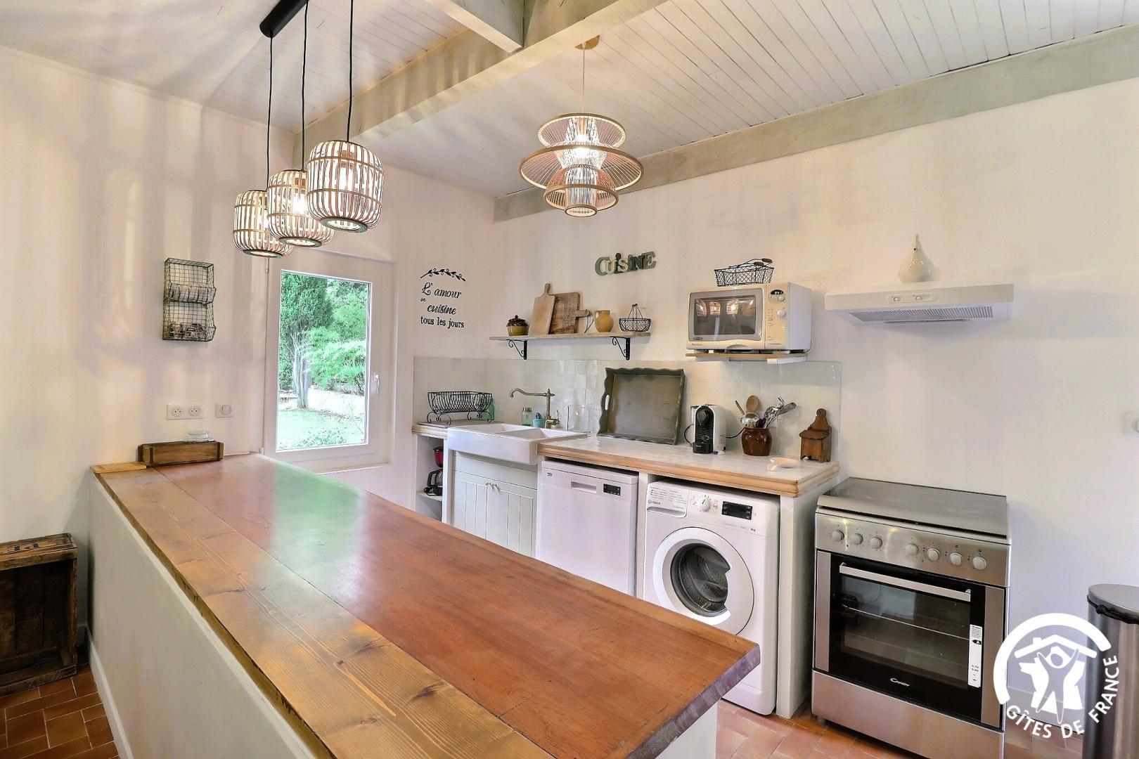 – Cuisine ouverte sur le séjour équipée avec cuisinière 3 feux gaz et 1 électrique, four électrique, hotte aspirante, réfrigérateur, congélateur, micro-ondes, lave-vaisselle et lave-linge.