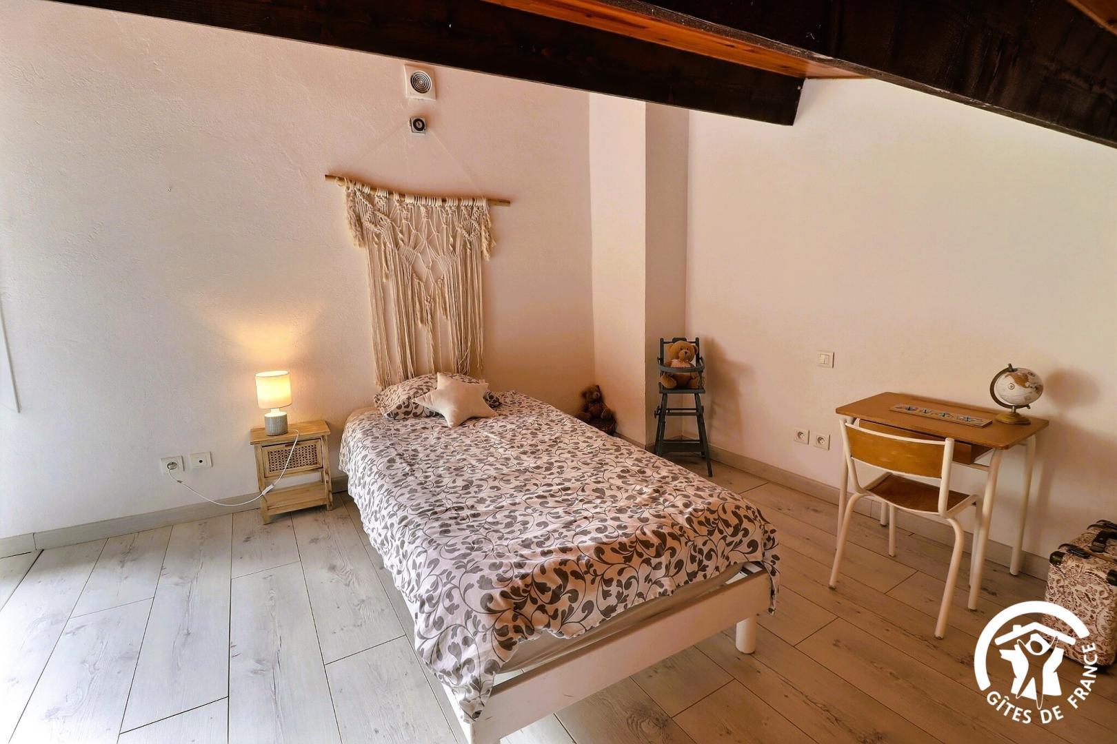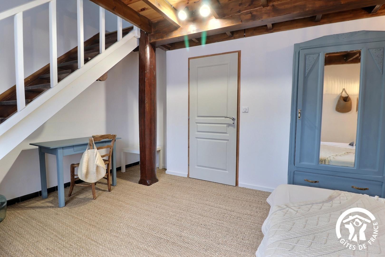 – Une première chambre avec un lit 2 personnes 160x200cm, armoire, étagères et malle.