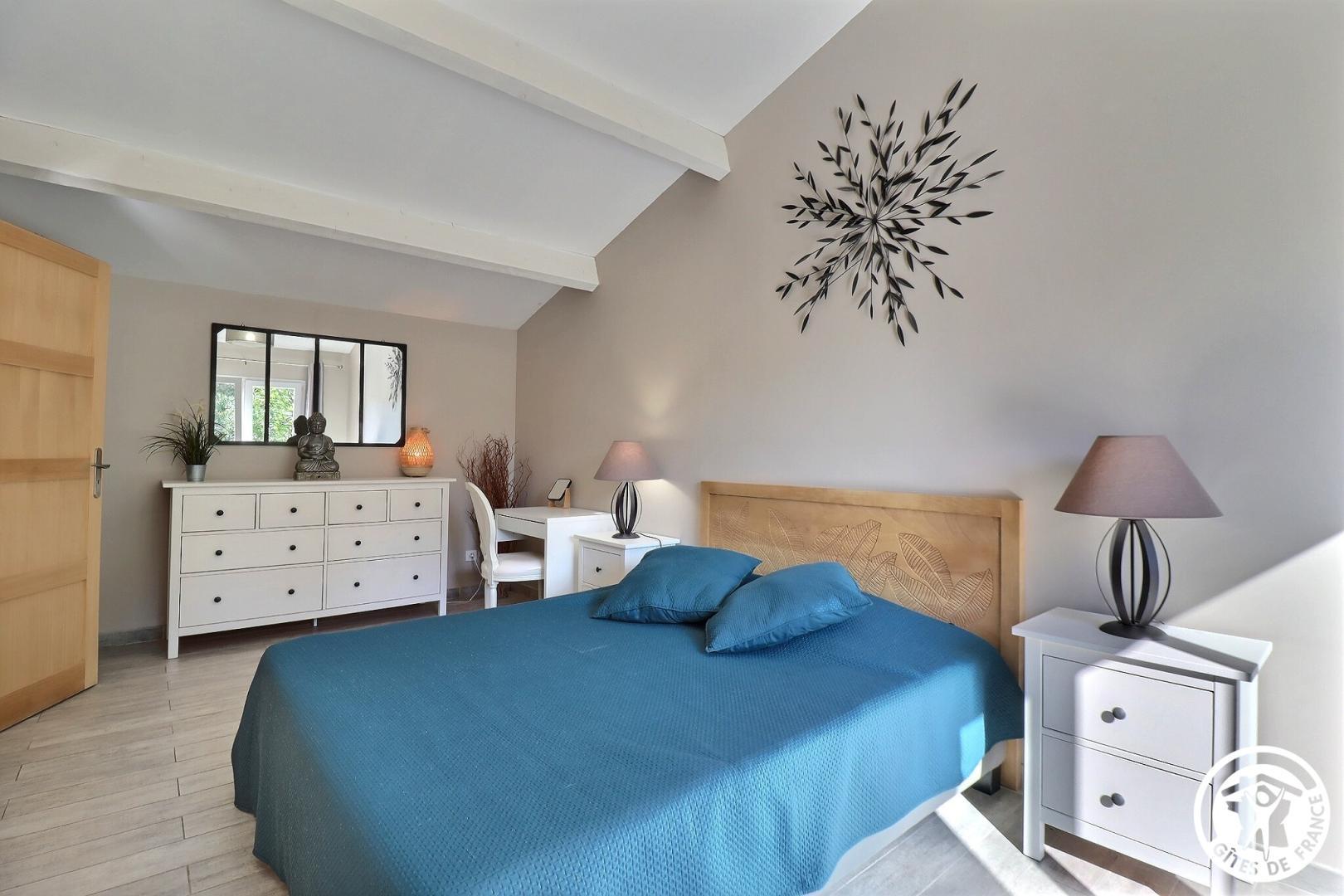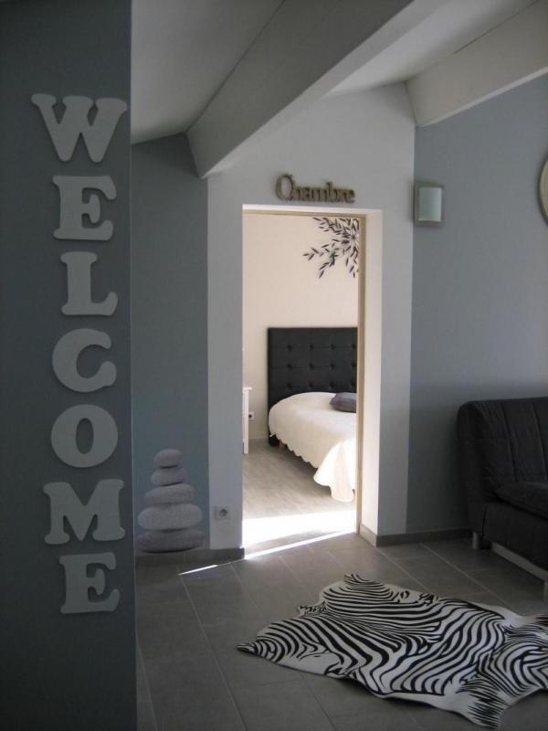 Belle chambre ouvrant également sur la terrasse, avec lit 2 personnes (180x200). Coin nuit dans l’entrée avec 2 lits superposés d’une personne. Salle d’eau/wc. Wi-fi. Chauffage électrique et draps inclus. Location linge de toilette (5€/personne). Ménage sur demande. Barbecue. Lit et chaise bébé sur demande. Parking devant la maison ou à l’intérieur de la propriété. Taxe de séjour en sus. Animaux acceptés sous conditions : voir avec le propriétaire (supplément et caution ménage).