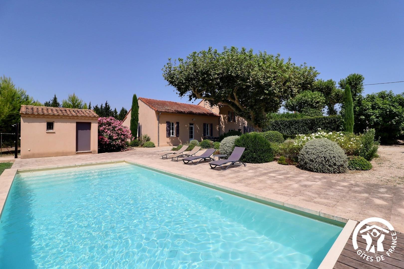En pleine campagne entre Alpilles et Luberon, mazet indépendant sur un terrain de 1200 m² entièrement clôturé. Autour d’un jardin paysager vous disposez d’une piscine privative sécurisée (volet intégré) de 10x4m, profondeur 1.10m, ouverte de mai à septembre avec ses bains de soleil et d’une douche extérieure solaire.