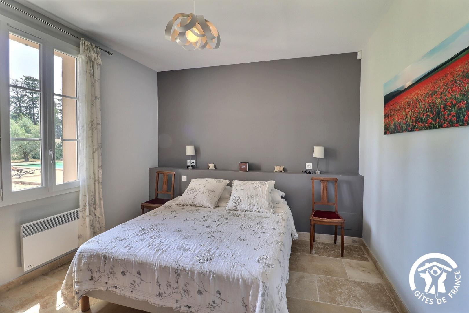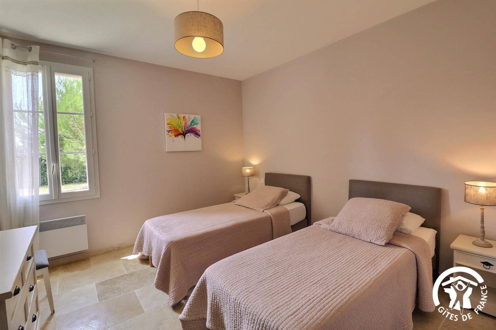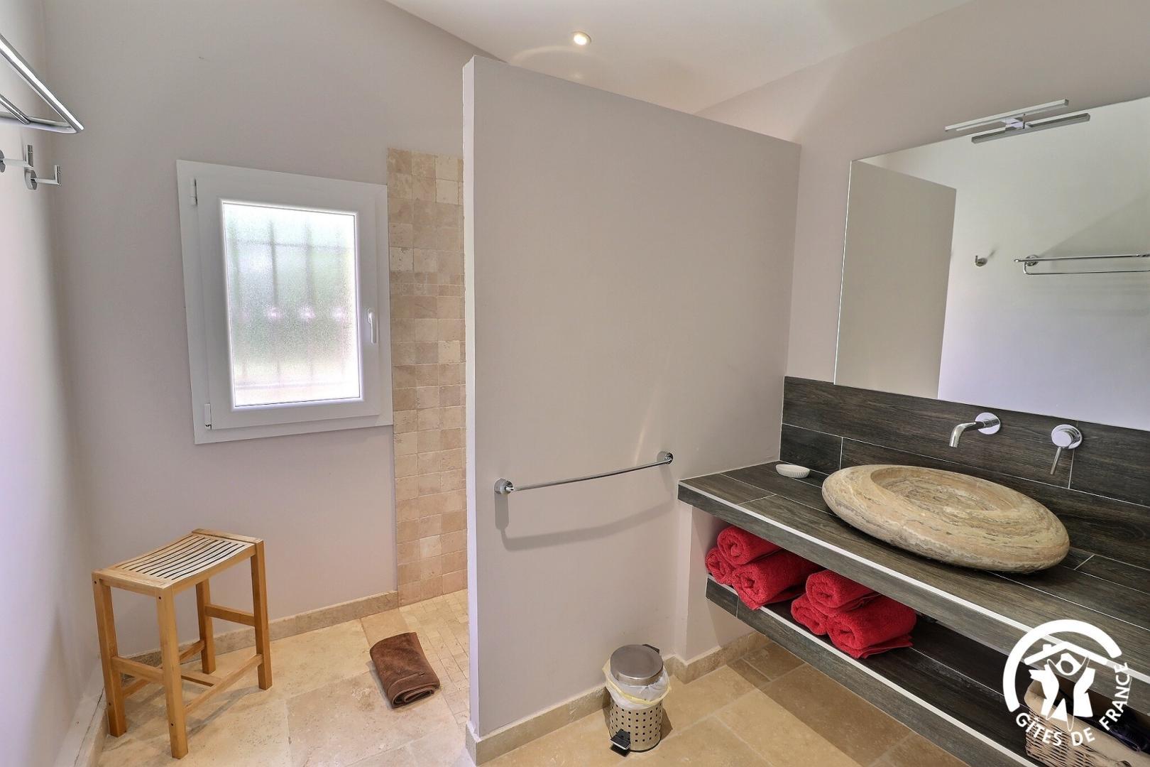– Une chambre avec 1 lit en 160 x 200 et une deuxième avec 2 lits en 90 x 200. -Salle d’eau avec douche à l’italienne et vasque en marbre.