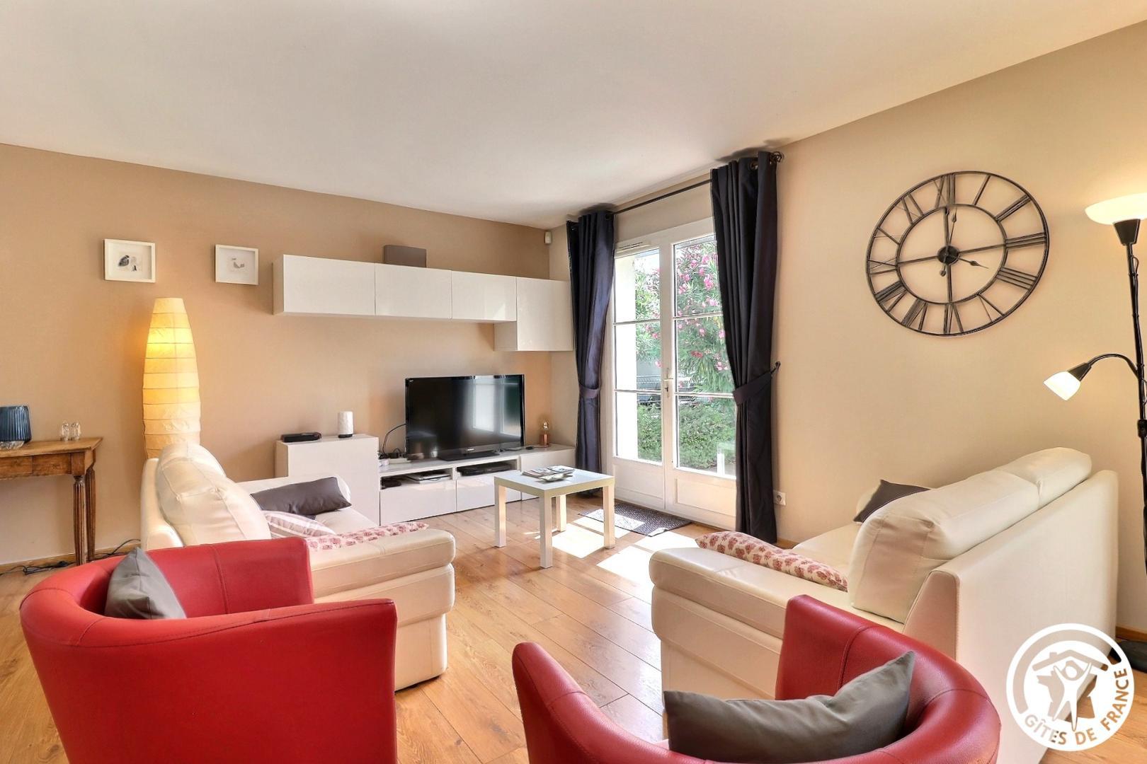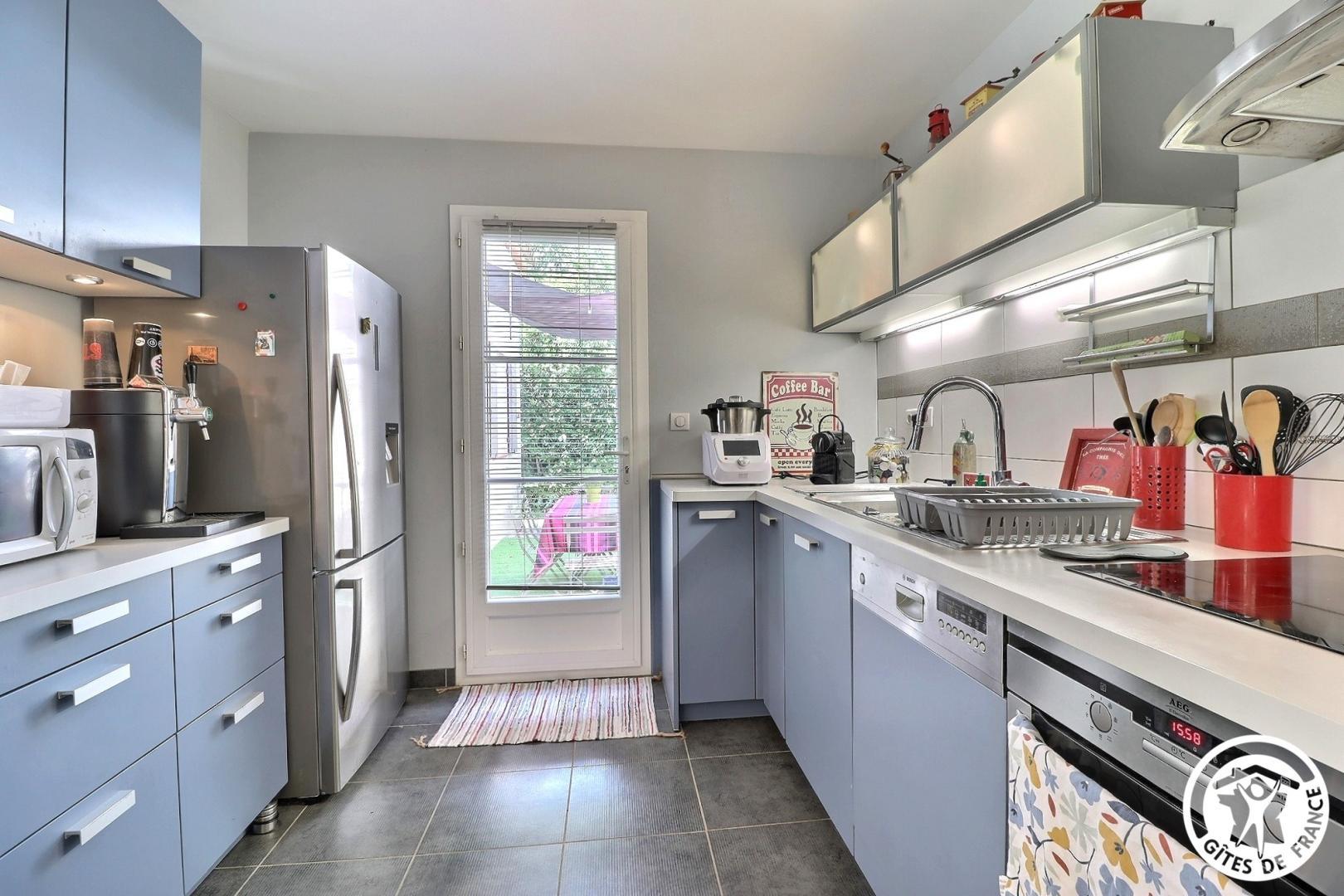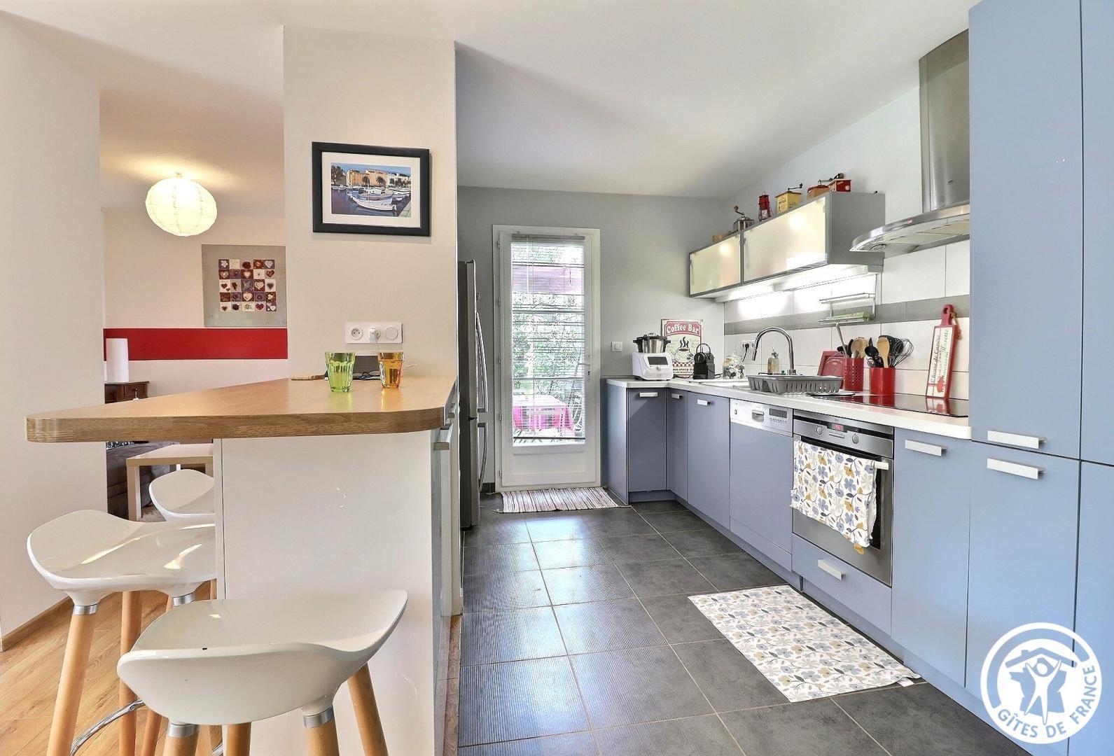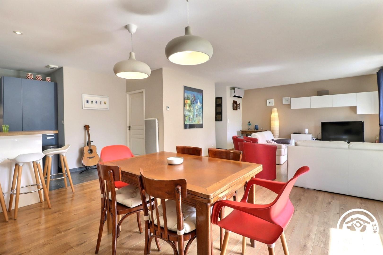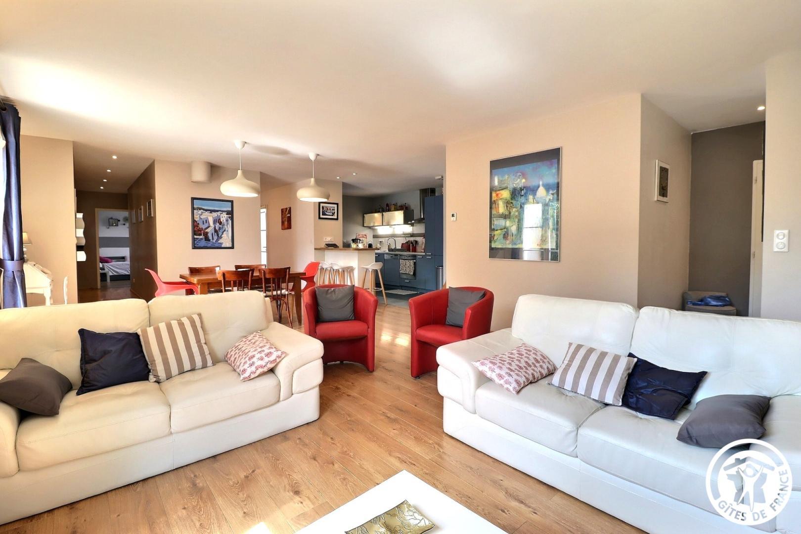 – Grand séjour de 50 m² disposant d’un salon avec canapés cuir, fauteuils, grande TV écran plat connectée, jeux de société, lecteur DVD (DVD à disposition). Espace repas pour 6 personnes. Cuisine équipée ouverte sur l’espace repas avec bar et tabourets hauts : réfrigérateur/congélateur, plaque 4 feux induction, hotte, four, hachoir, lave-vaisselle, micro-ondes, cafetière à dosettes Nespresso et robot de cuisine.