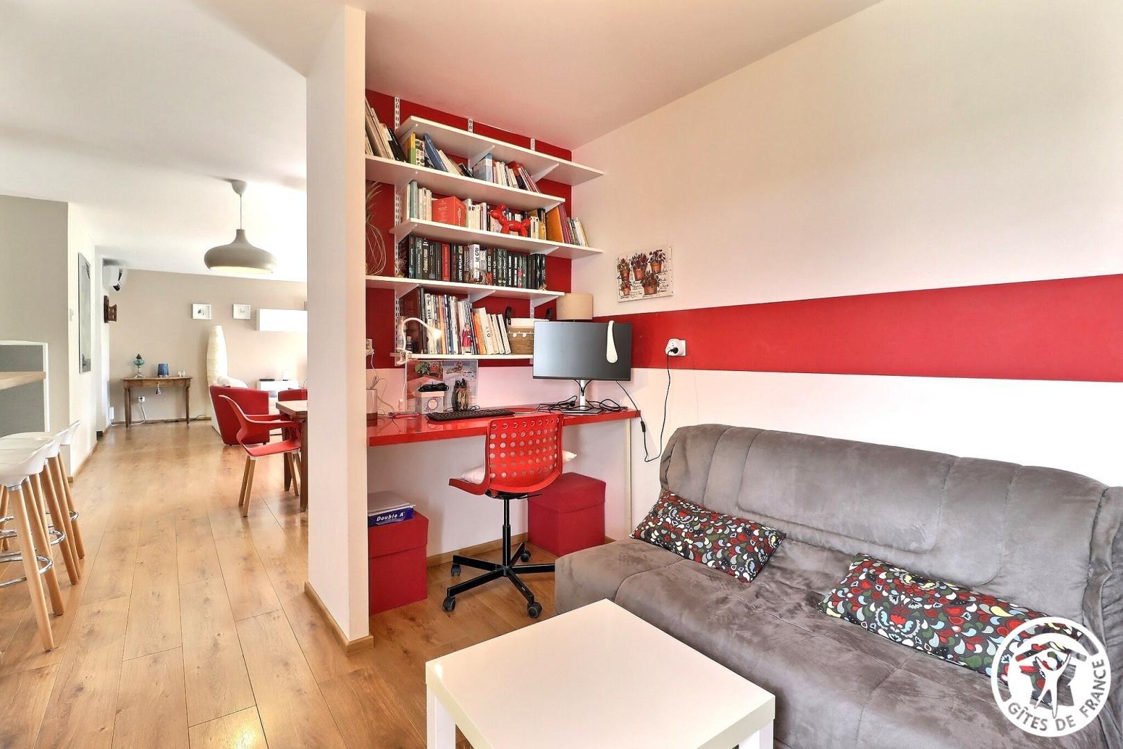 – Coin bureau avec équipement pour télétravailler (écran, souris, clavier, casque), canapé, fauteuil et bibliothèque.