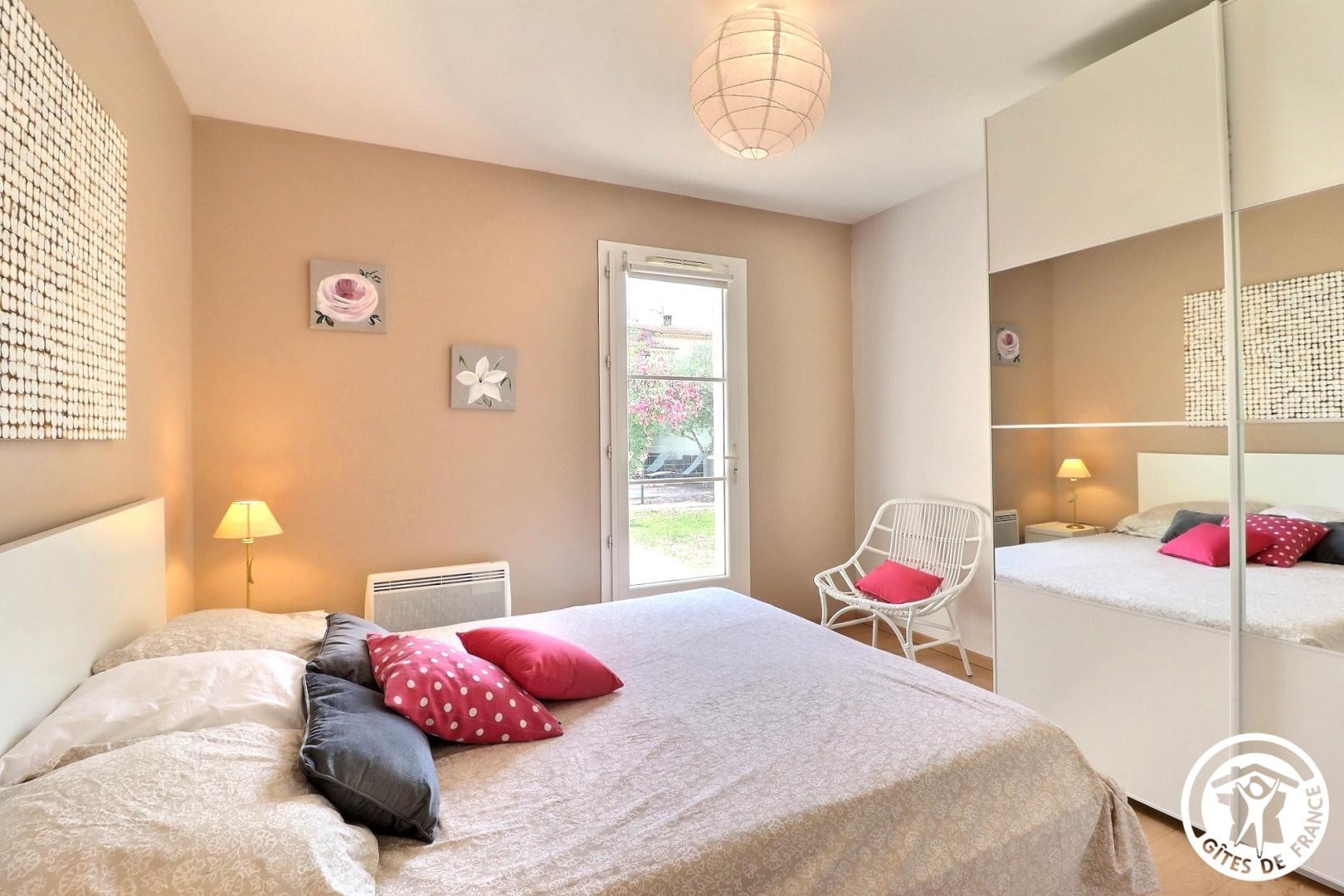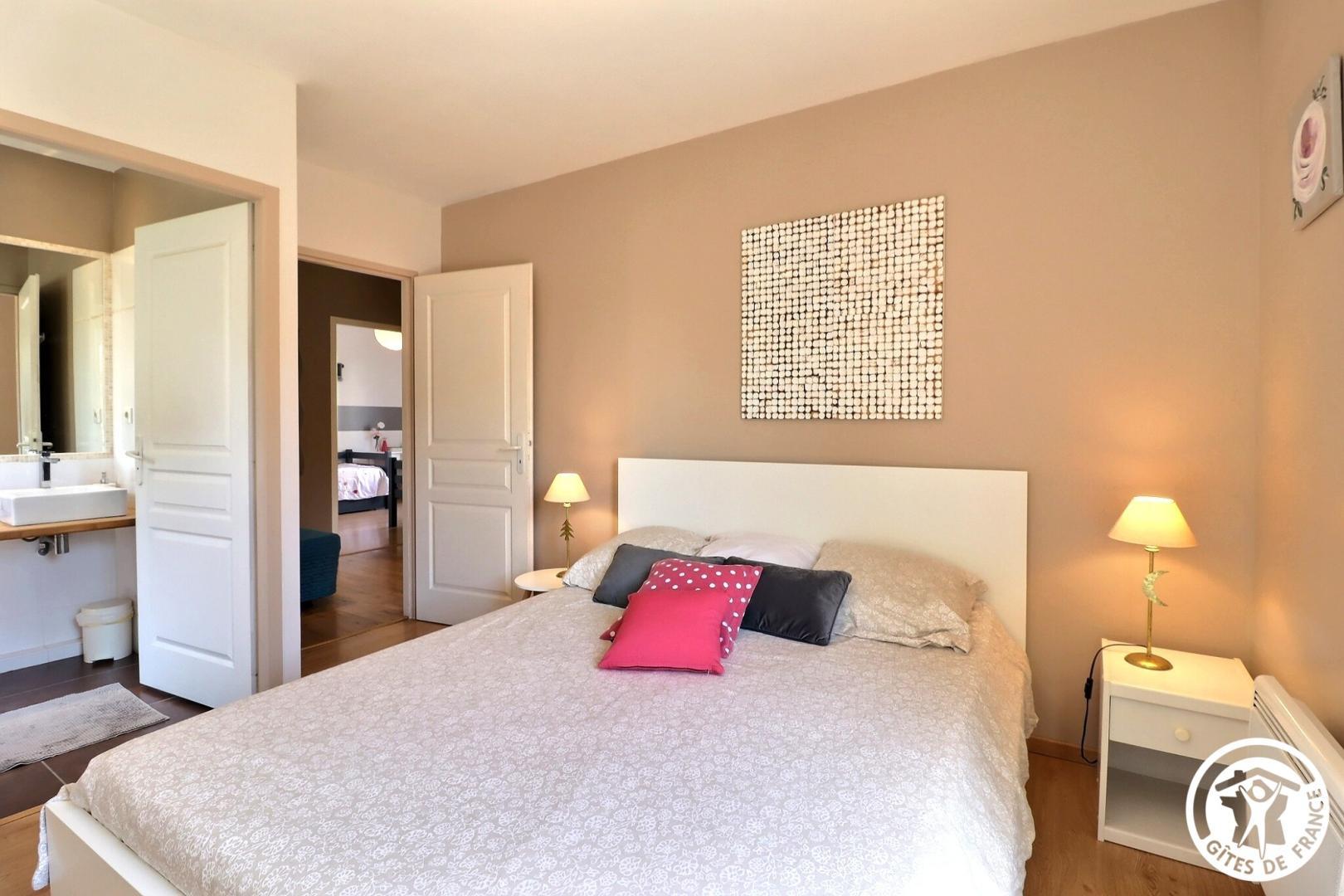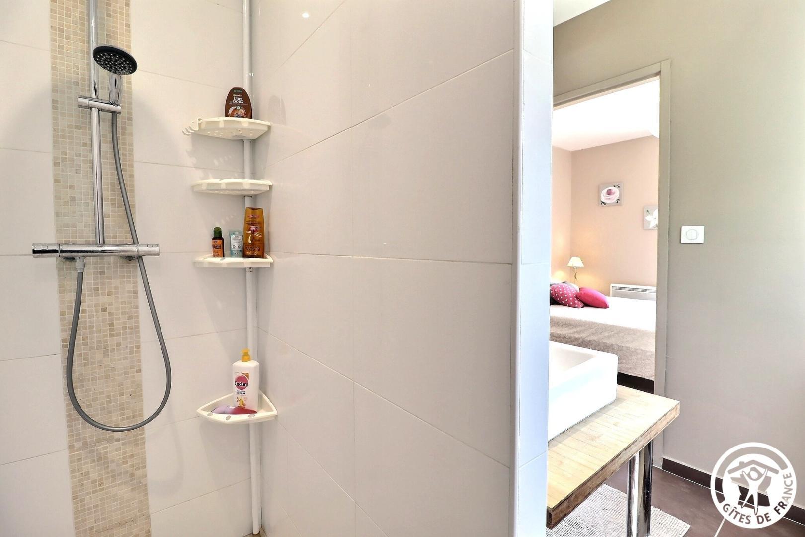 – 1ère chambre avec un lit 2 personnes 160x200cm, fauteuil, dressing. Salle d’eau privative pour cette chambre (double vasque, douche type italienne, porte-serviettes chauffant) et accès direct à l’une des terrasses côté piscine.