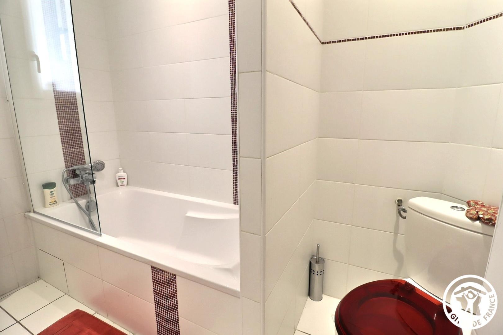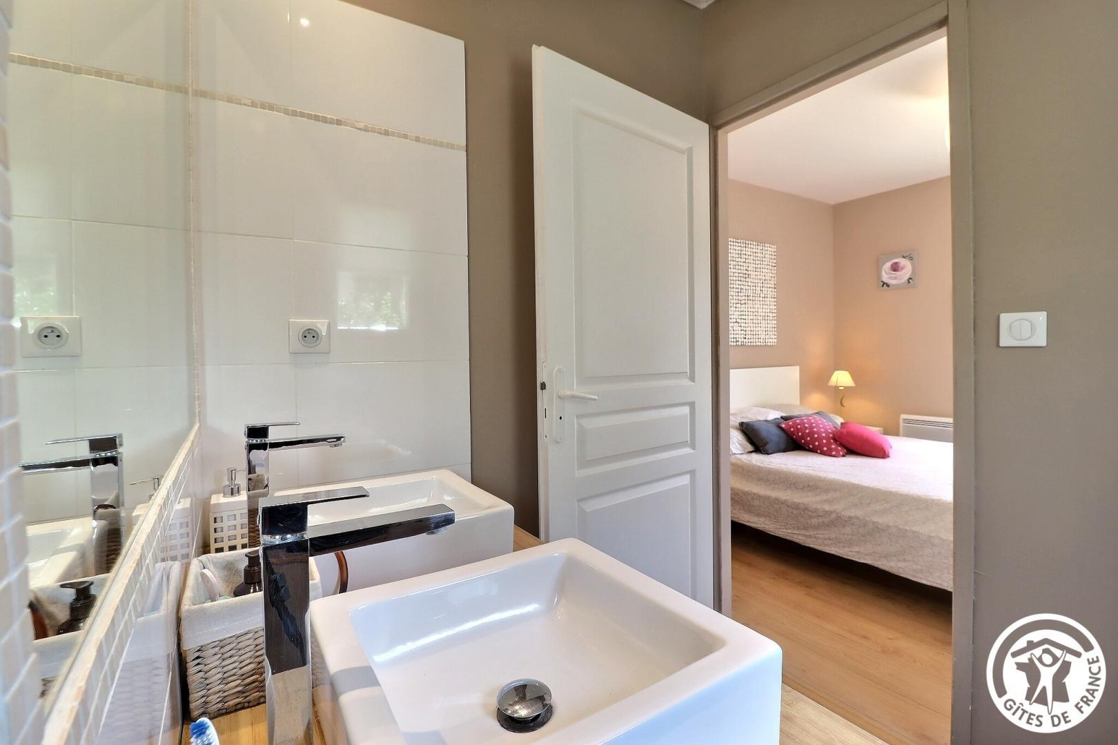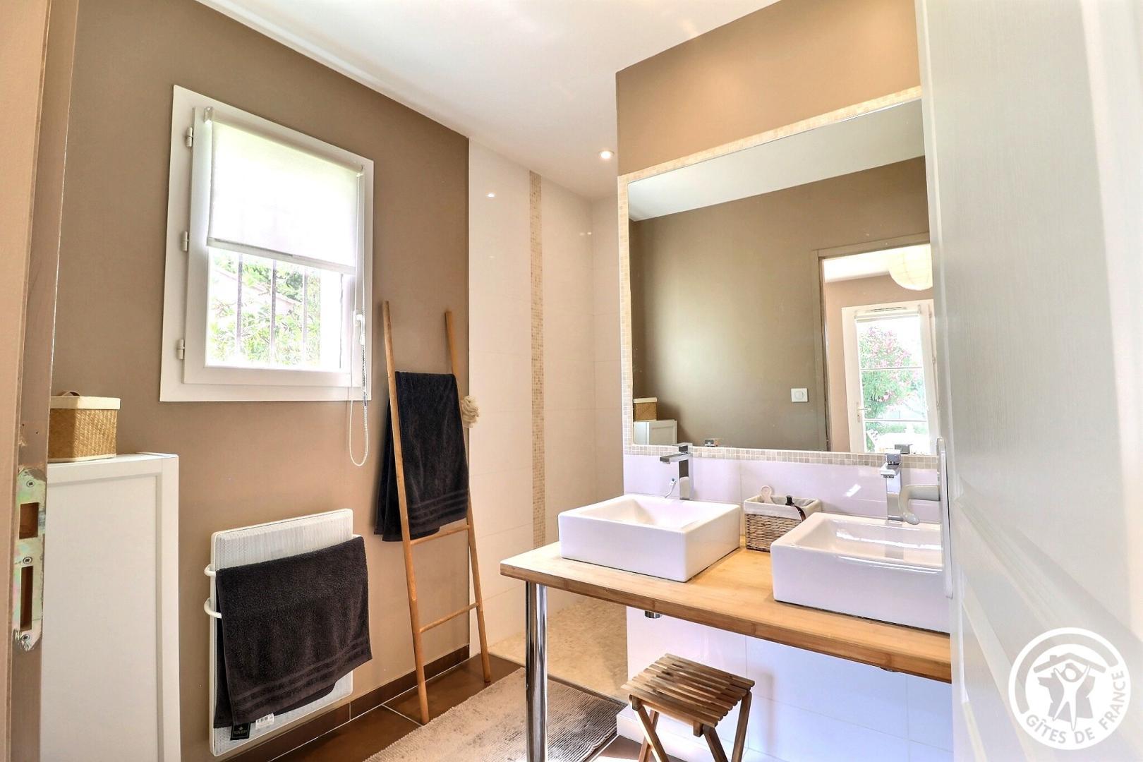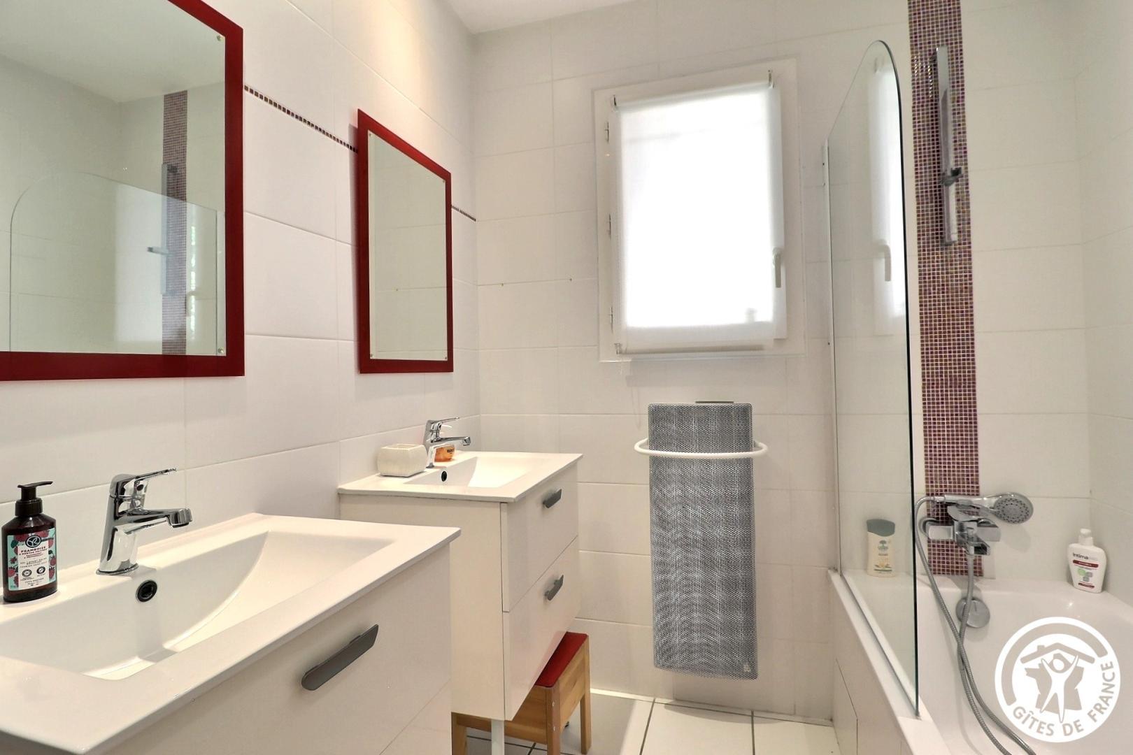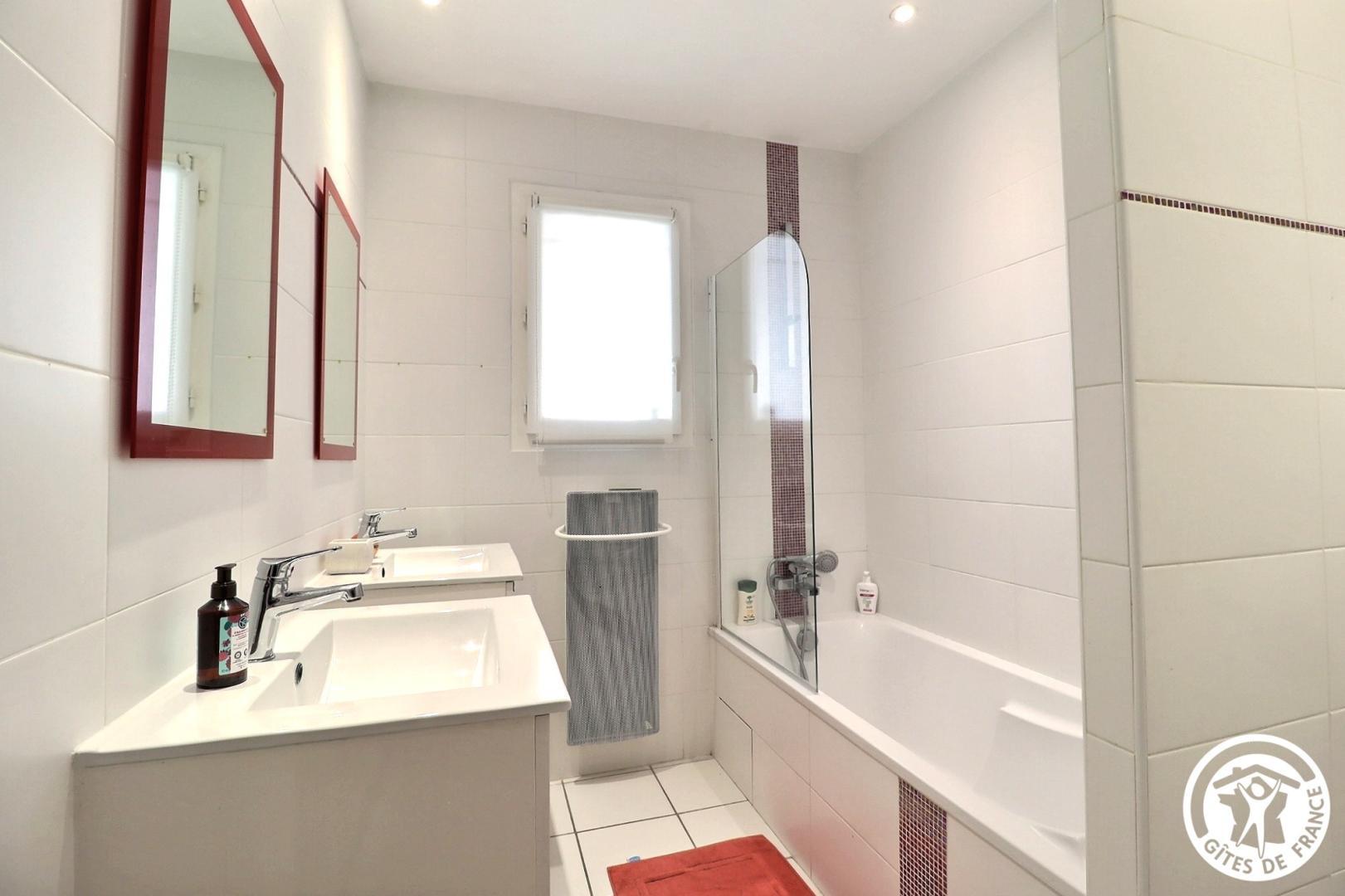 – Salle de bain avec double vasque, baignoire, porte-serviettes chauffant et WC.