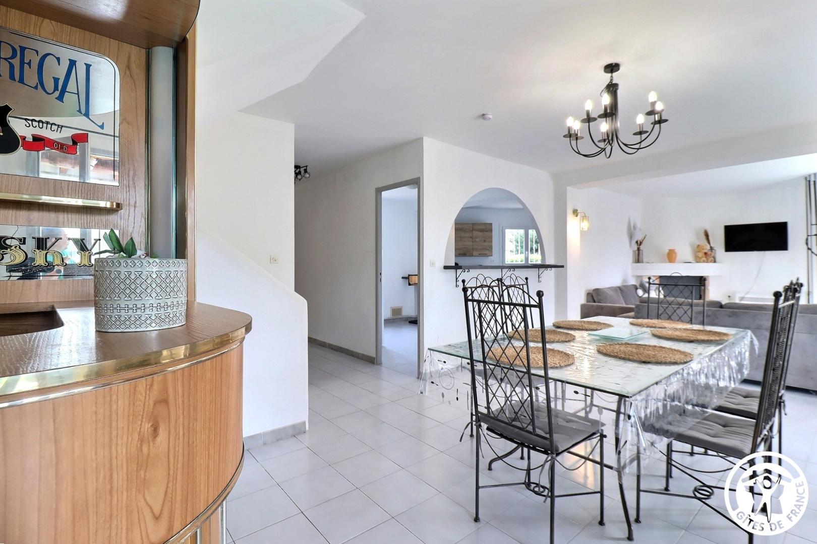 – Un 1er salon / salle à manger avec canapés, TV écran plat, cheminée d’ornement, espace repas pour 6 personnes et bar.