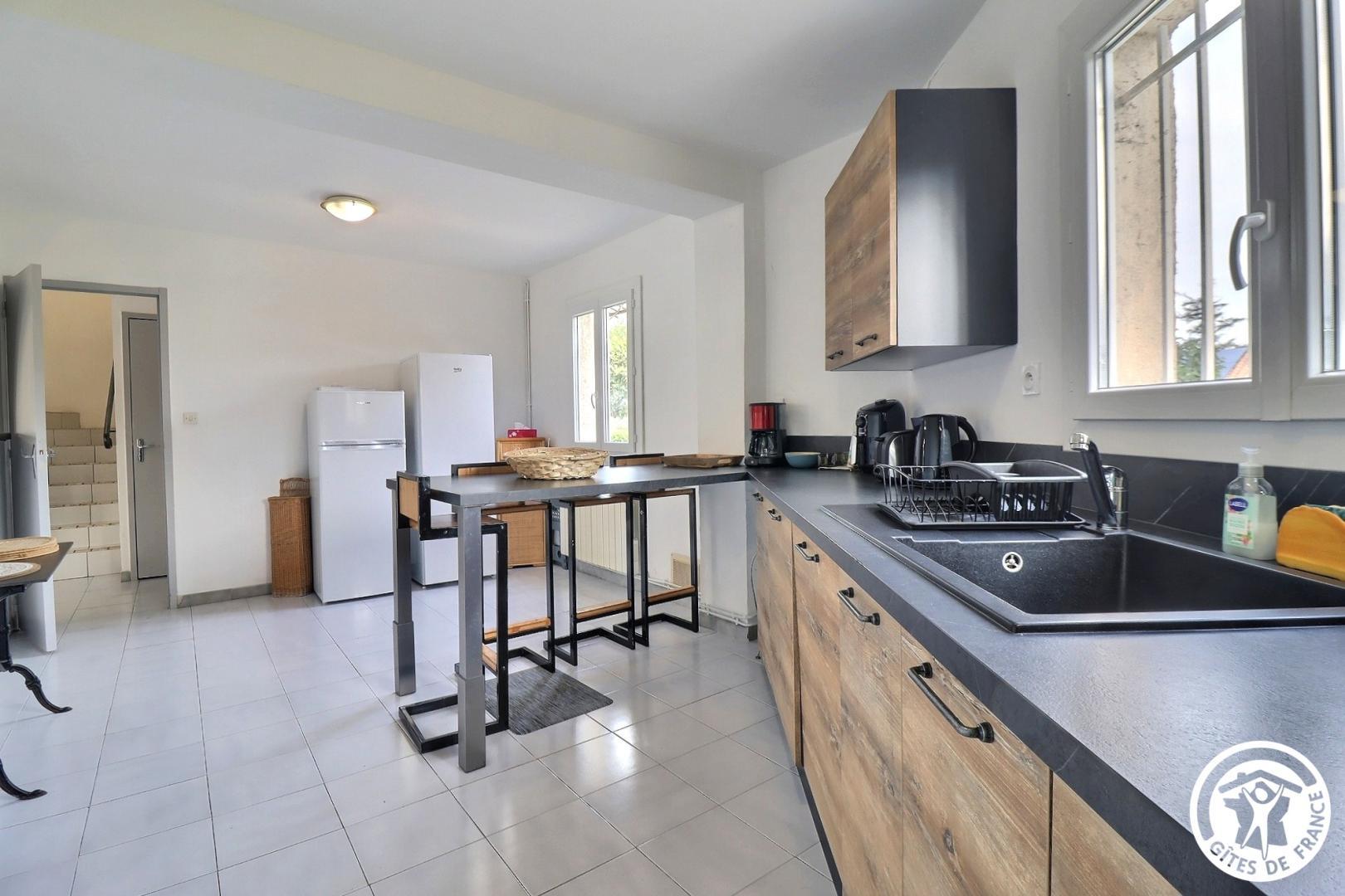 – Cuisine équipée ouverte sur la salle à manger par un passe-plat avec plaque 3 feux induction, hotte, four, micro-ondes, lave-vaisselle et grand plan de travail.