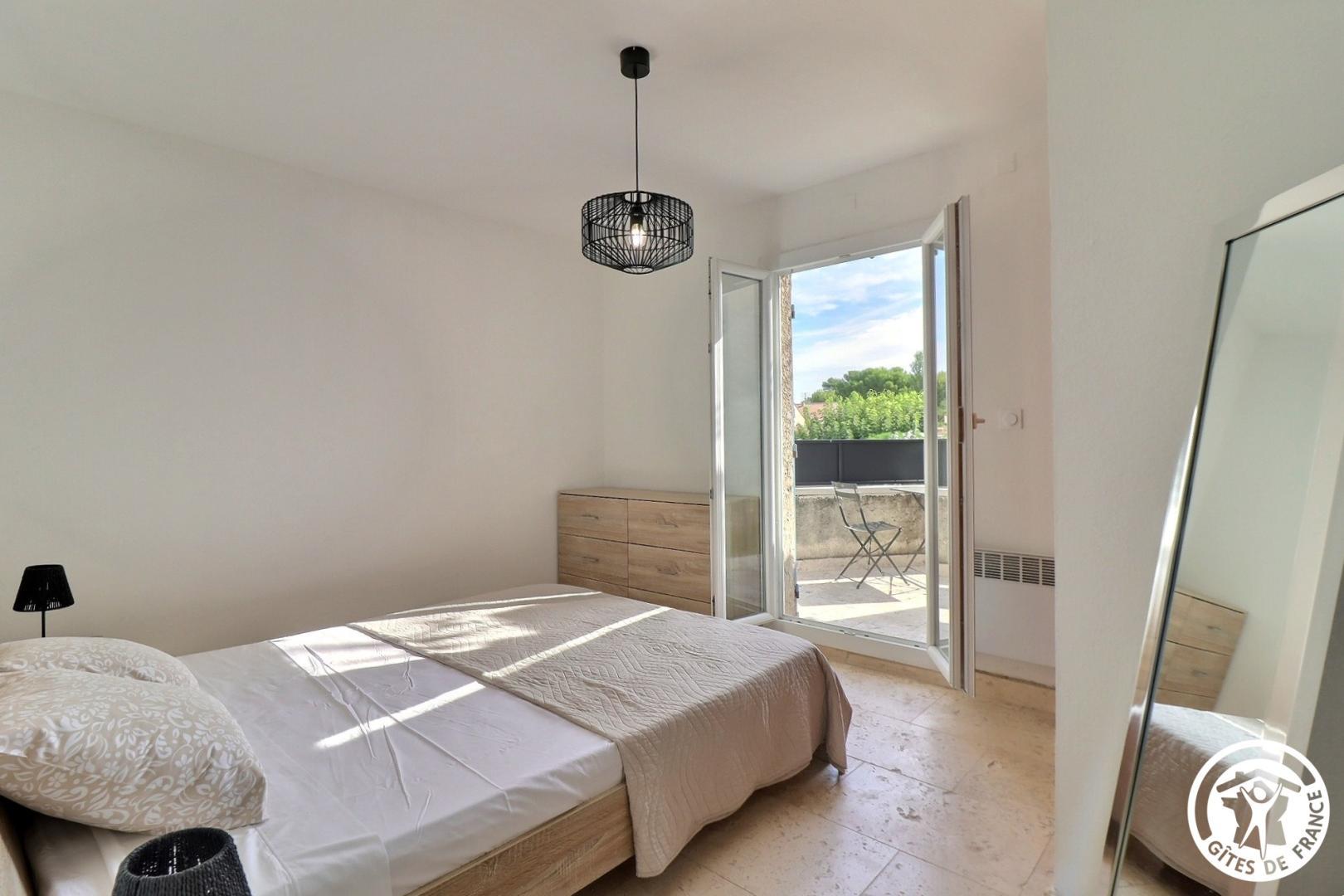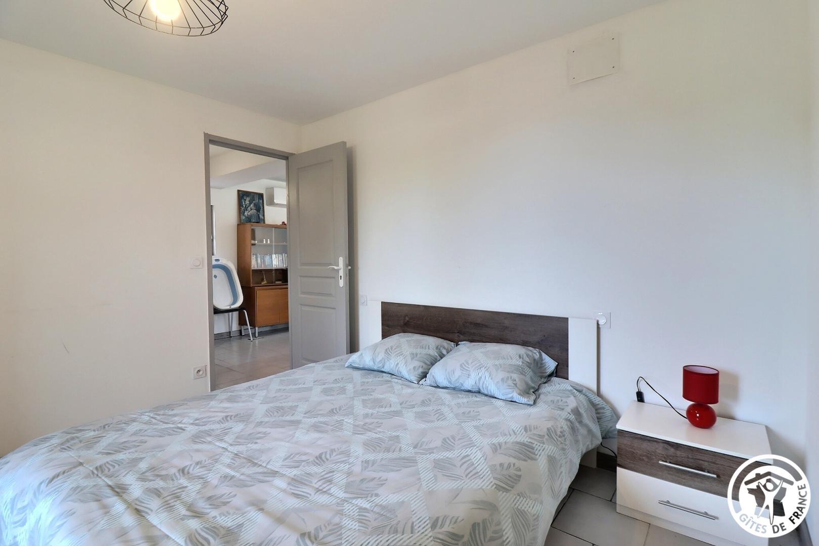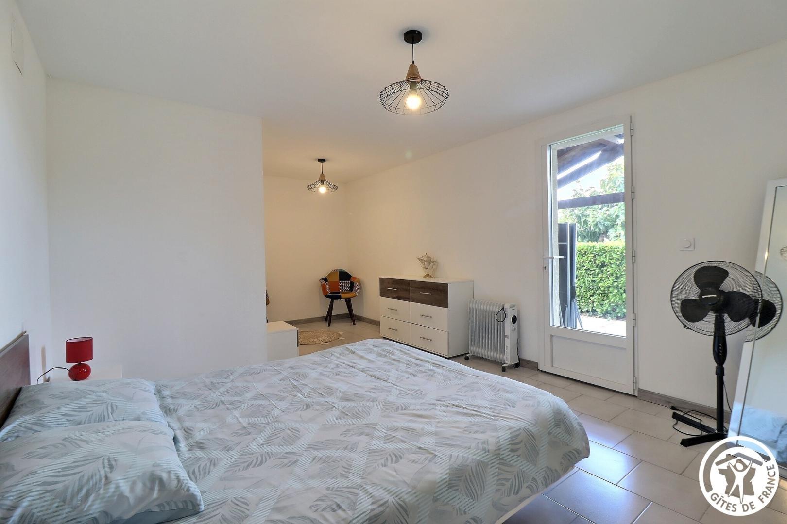 – Une 1ère chambre avec 1 lit 160x200cm, petit coin salon avec fauteuils et table basse et porte-fenêtre donnant dans le jardin.