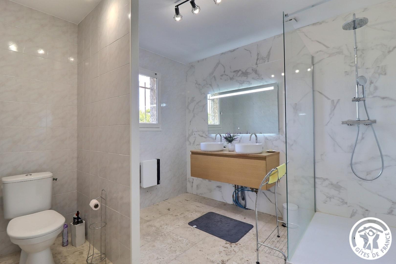 – Salle d’eau avec double vasque, grande douche à l’italienne, 2 porte-serviettes et WC.