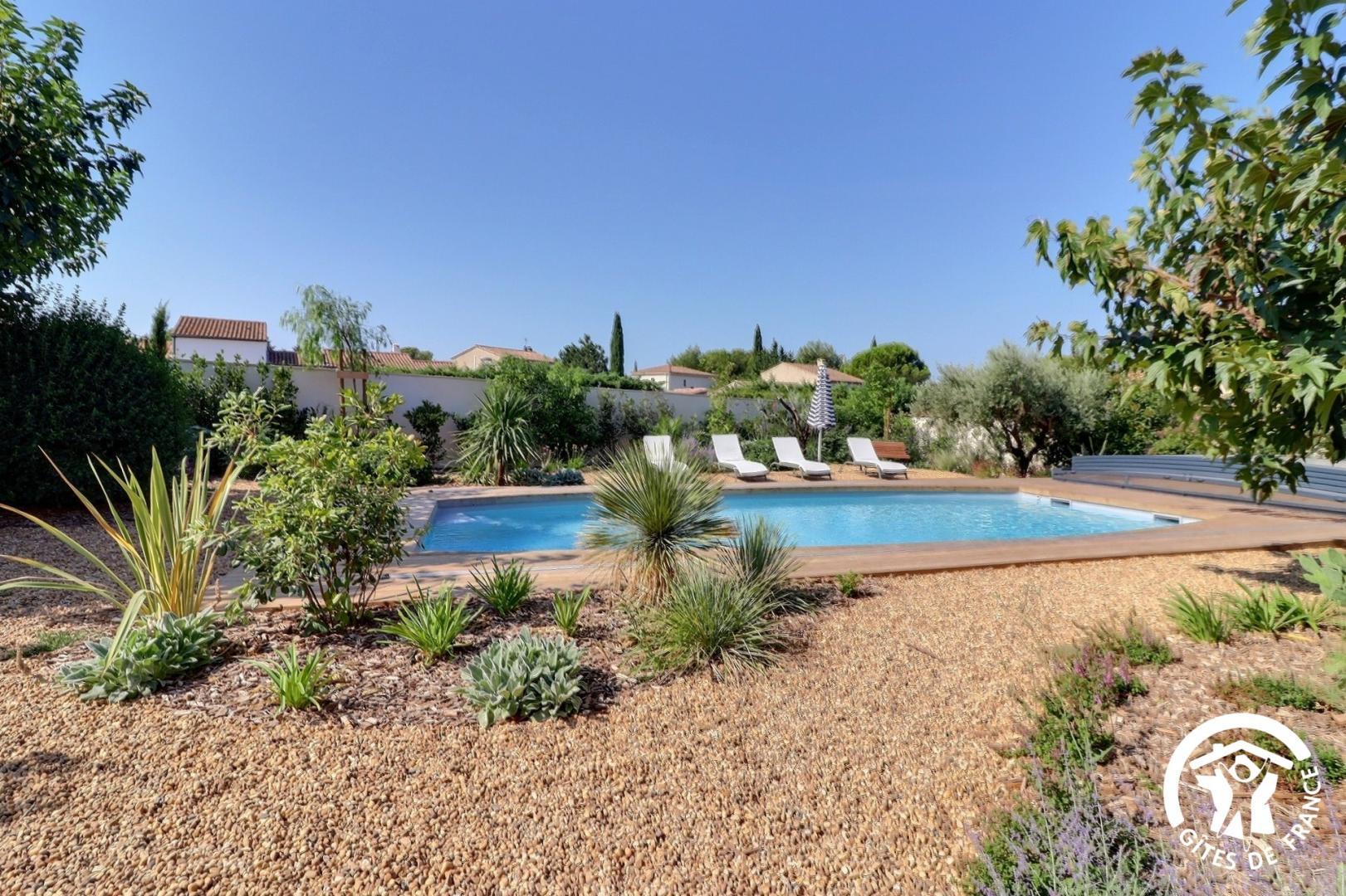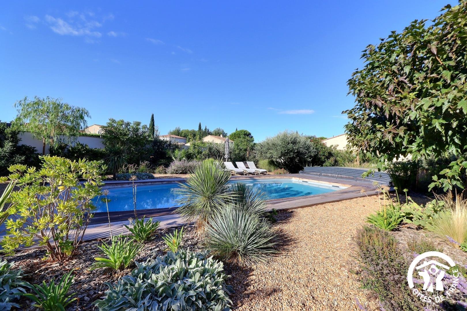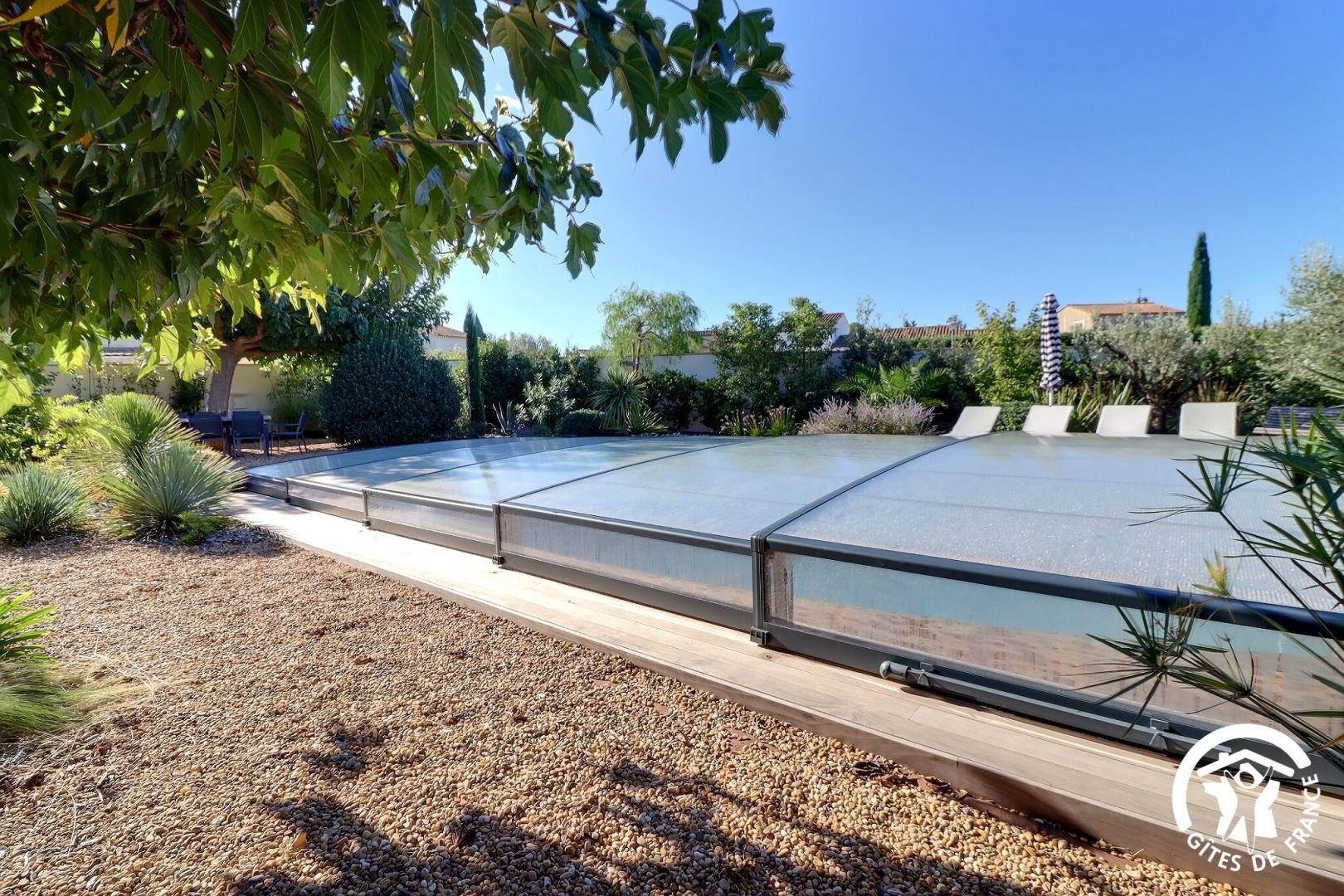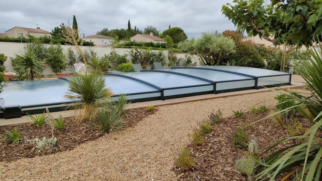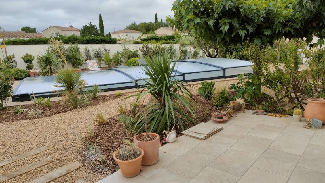 Il dispose d’un jardin paysagé de 1000m² avec deux terrasses, une au sud et une à l’ouest et d’une piscine 10x4.5 avec abri télescopique permettant de maintenir la chaleur de la piscine (ouverte de avril à fin septembre selon la météo - l’abri doit être fermé en cas de vent ce qui n’empêche pas de se baigner dessous).