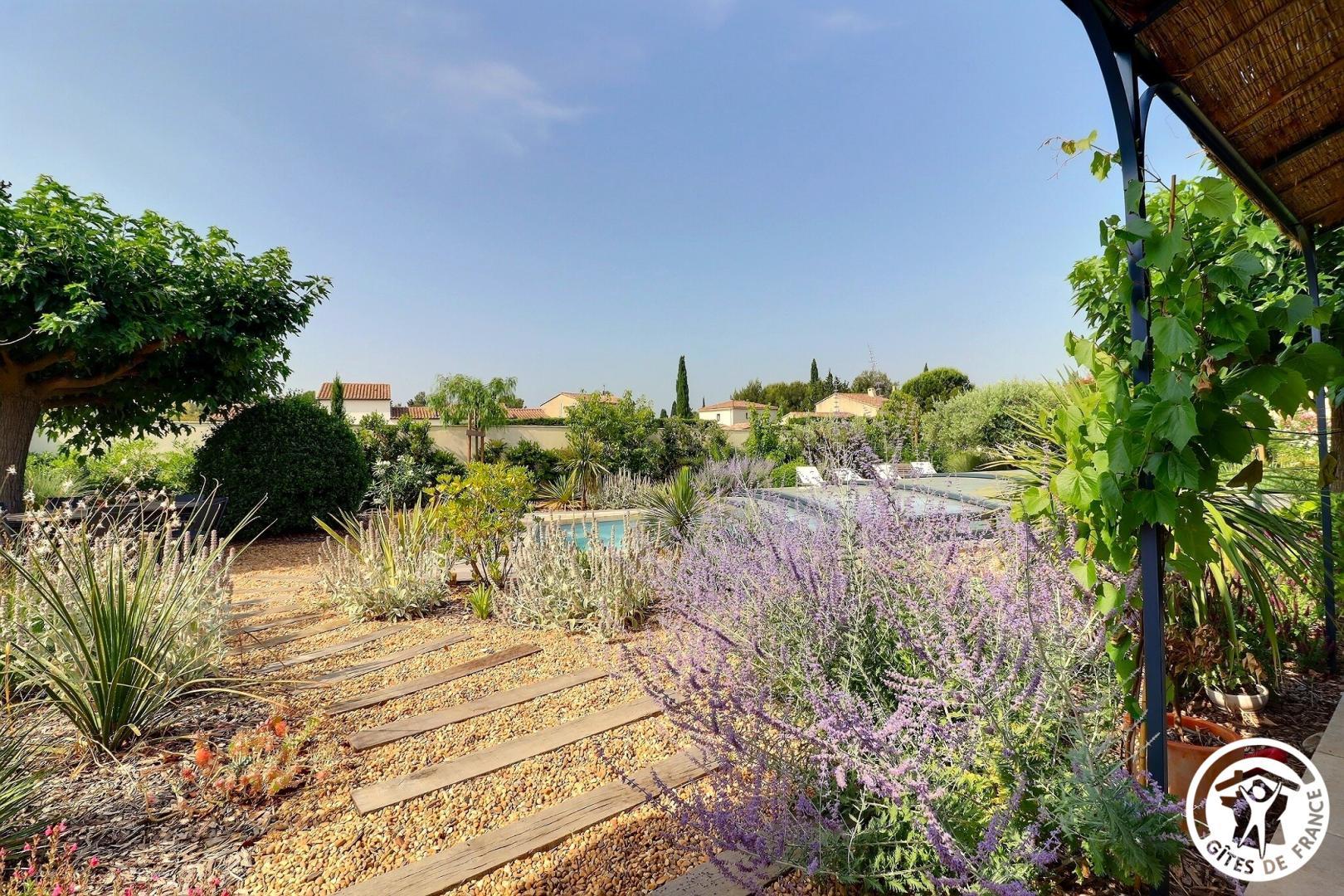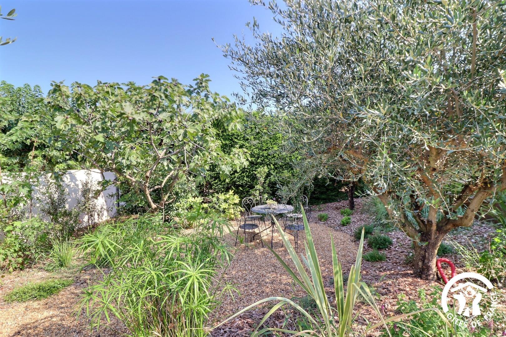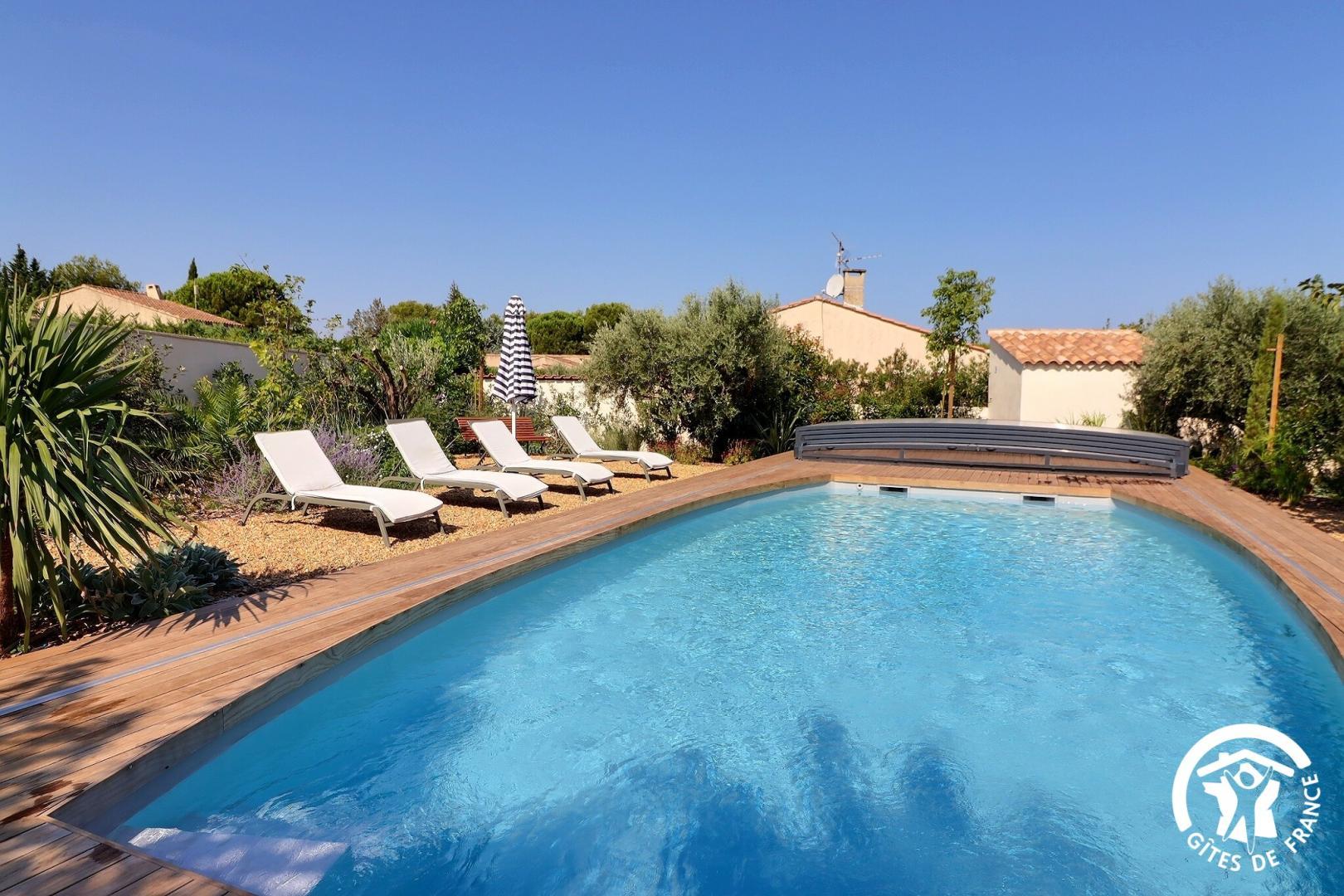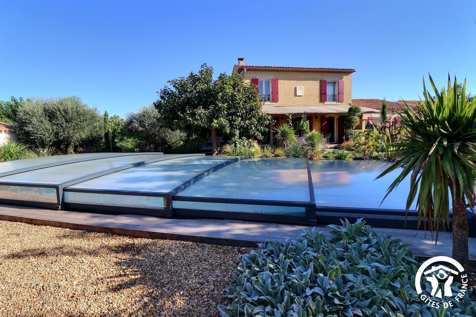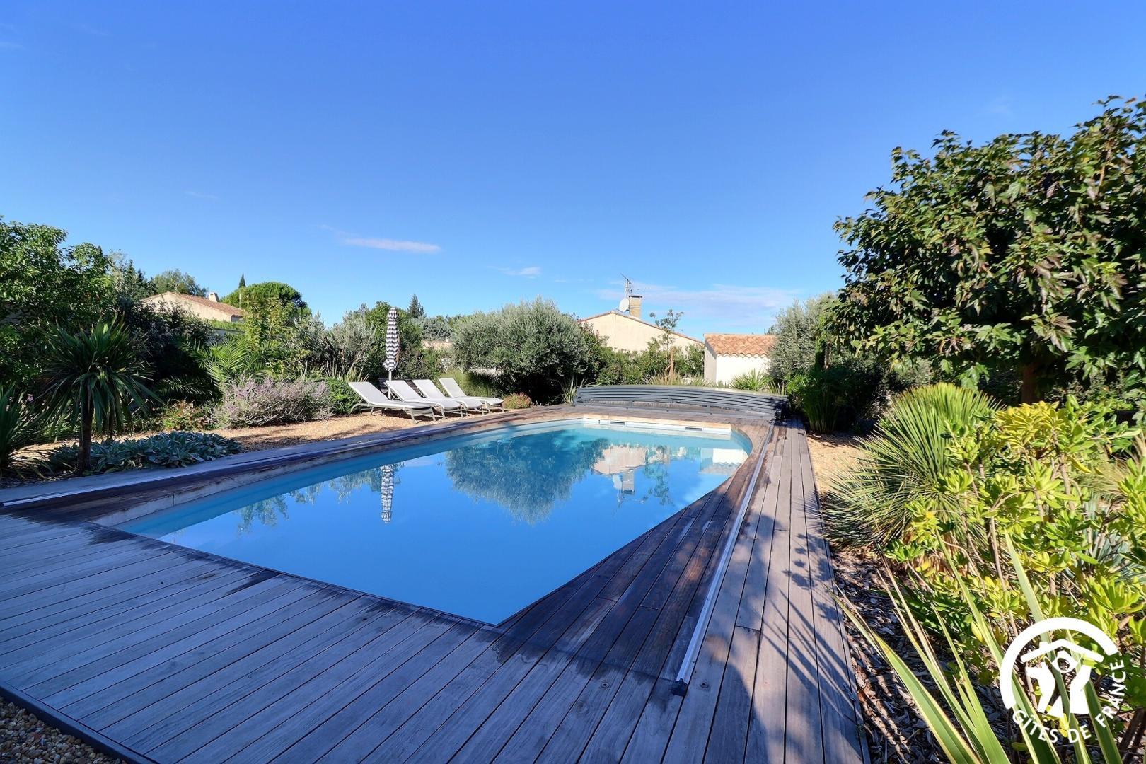 Il dispose d’un jardin paysagé de 1000m² avec deux terrasses, une au sud et une à l’ouest et d’une piscine 10x4.5 avec abri télescopique permettant de maintenir la chaleur de la piscine (ouverte de avril à fin septembre selon la météo - l’abri doit être fermé en cas de vent ce qui n’empêche pas de se baigner dessous).