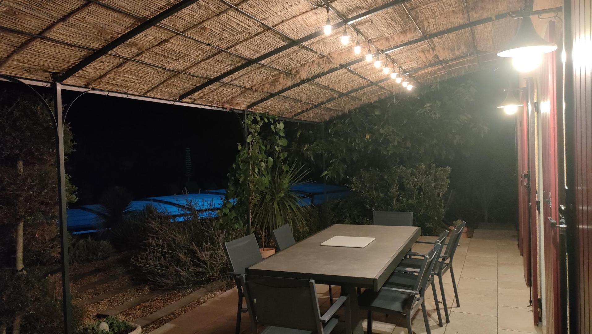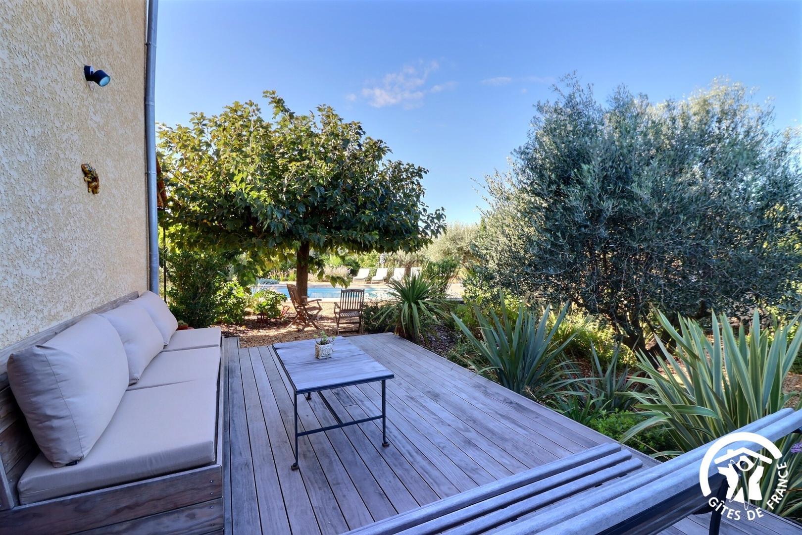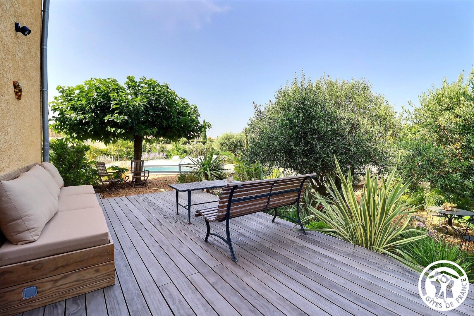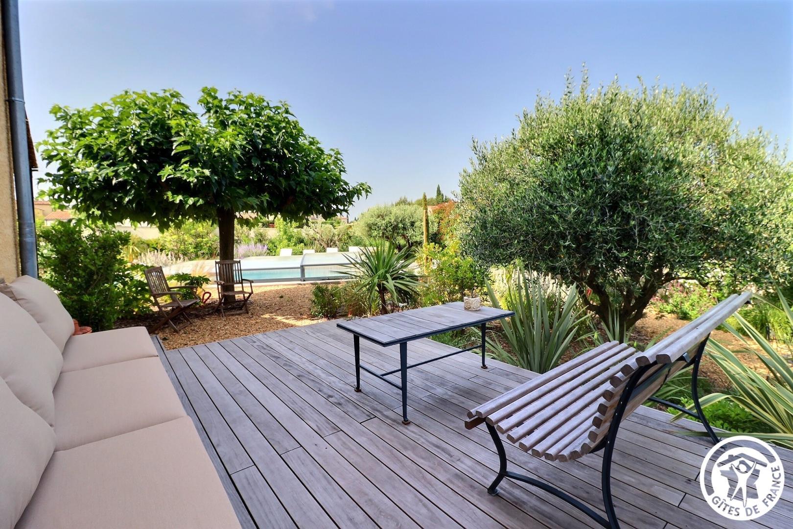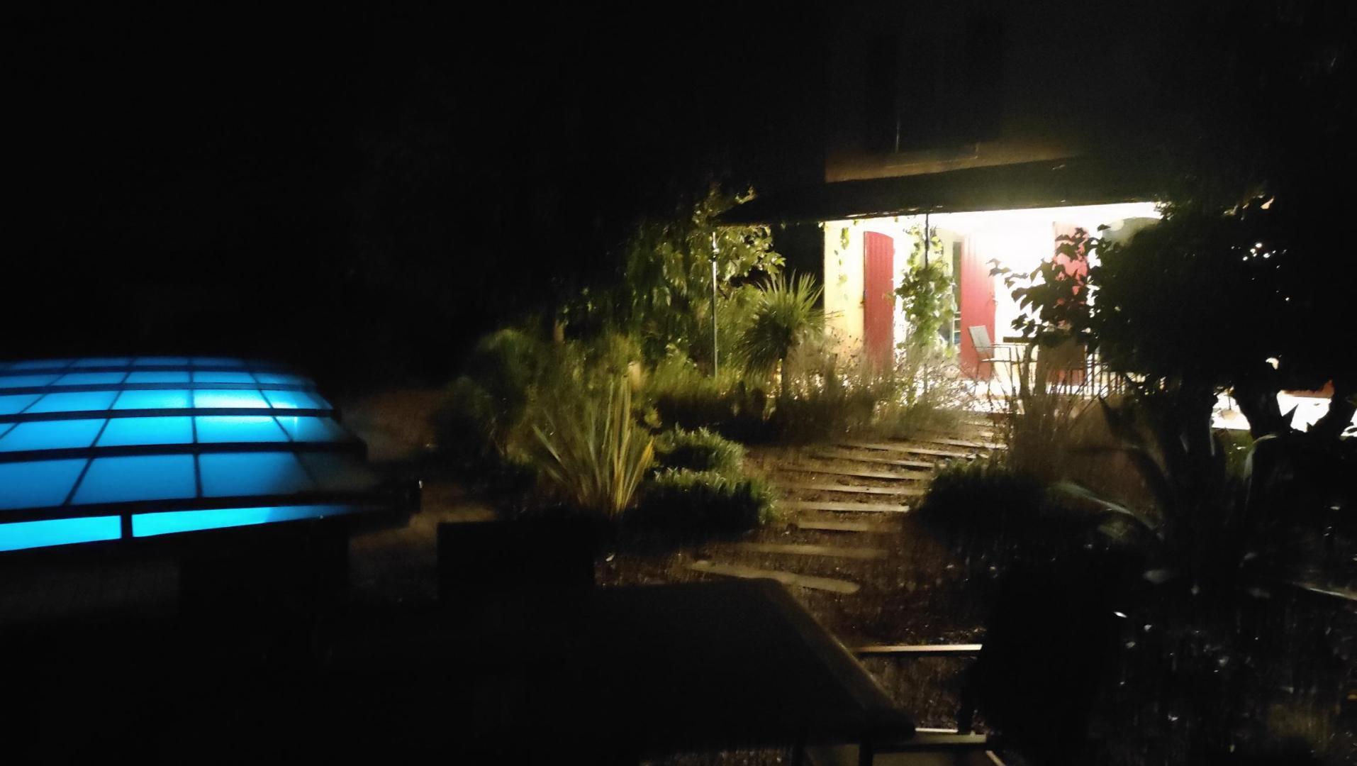 Il dispose d’un jardin paysagé de 1000m² avec deux terrasses, une au sud et une à l’ouest et d’une piscine 10x4.5 avec abri télescopique permettant de maintenir la chaleur de la piscine (ouverte de avril à fin septembre selon la météo - l’abri doit être fermé en cas de vent ce qui n’empêche pas de se baigner dessous).