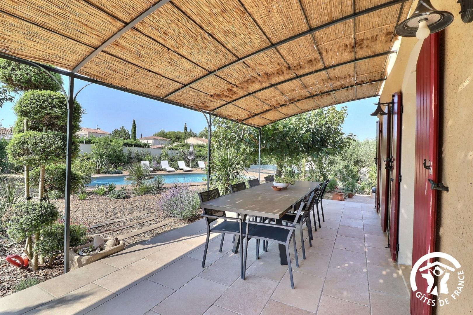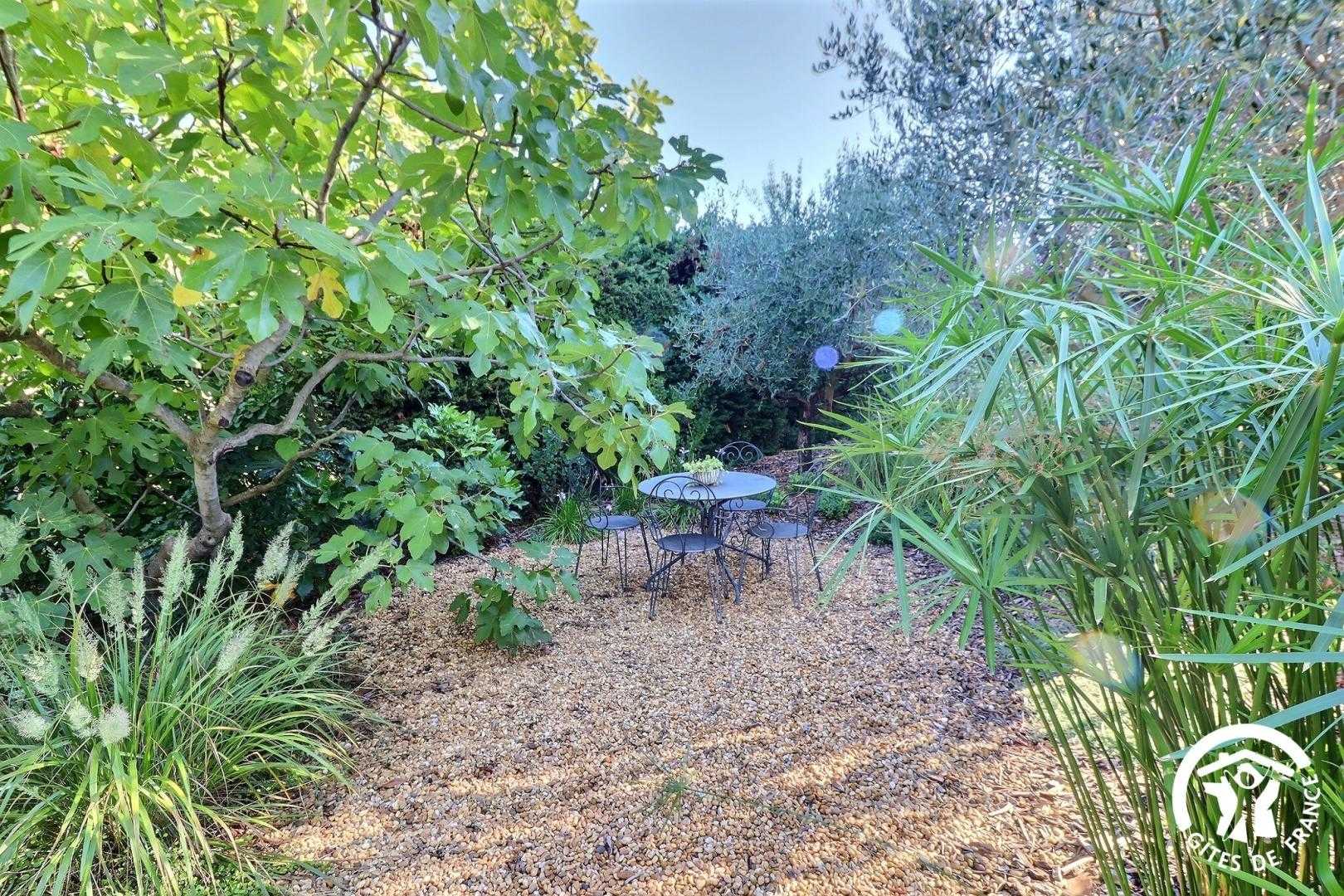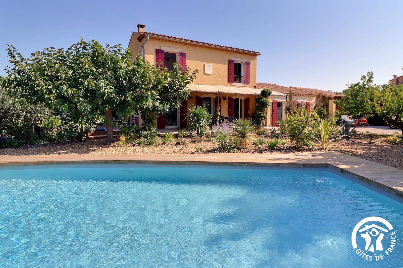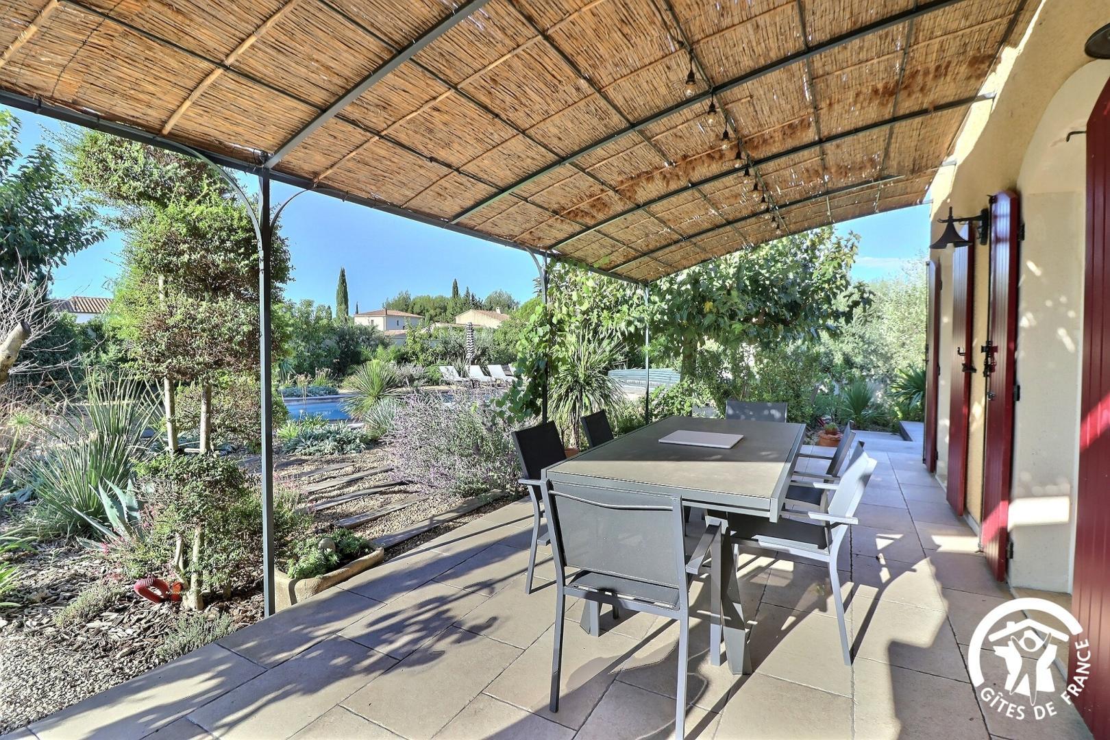 Il dispose d’un jardin paysagé de 1000m² avec deux terrasses, une au sud et une à l’ouest et d’une piscine 10x4.5 avec abri télescopique permettant de maintenir la chaleur de la piscine (ouverte de avril à fin septembre selon la météo - l’abri doit être fermé en cas de vent ce qui n’empêche pas de se baigner dessous).
