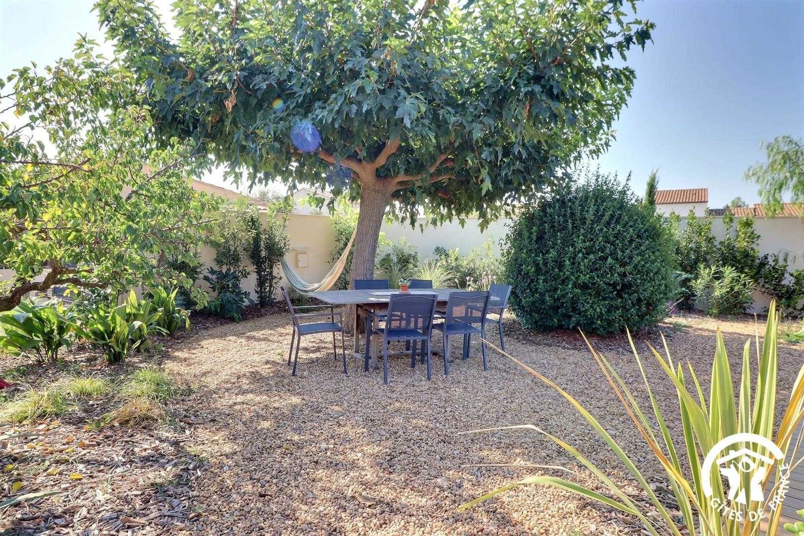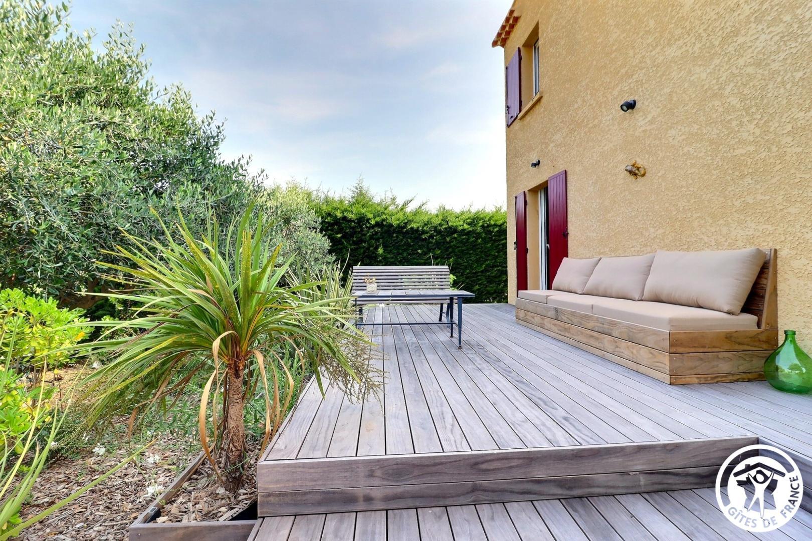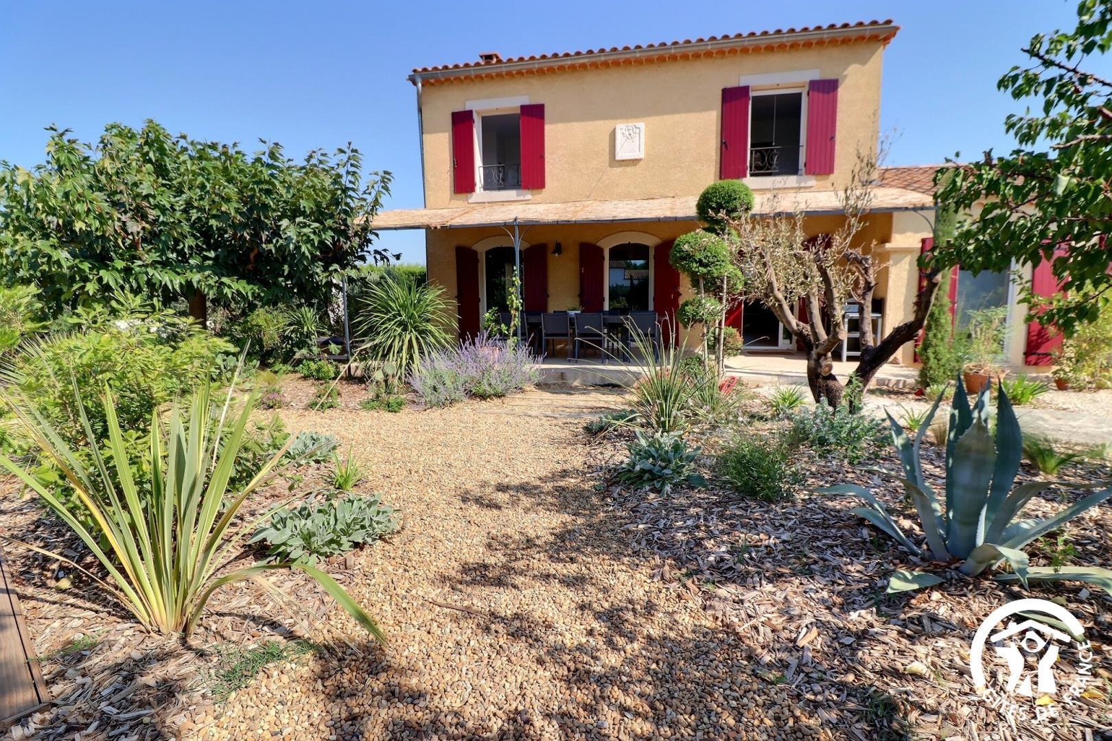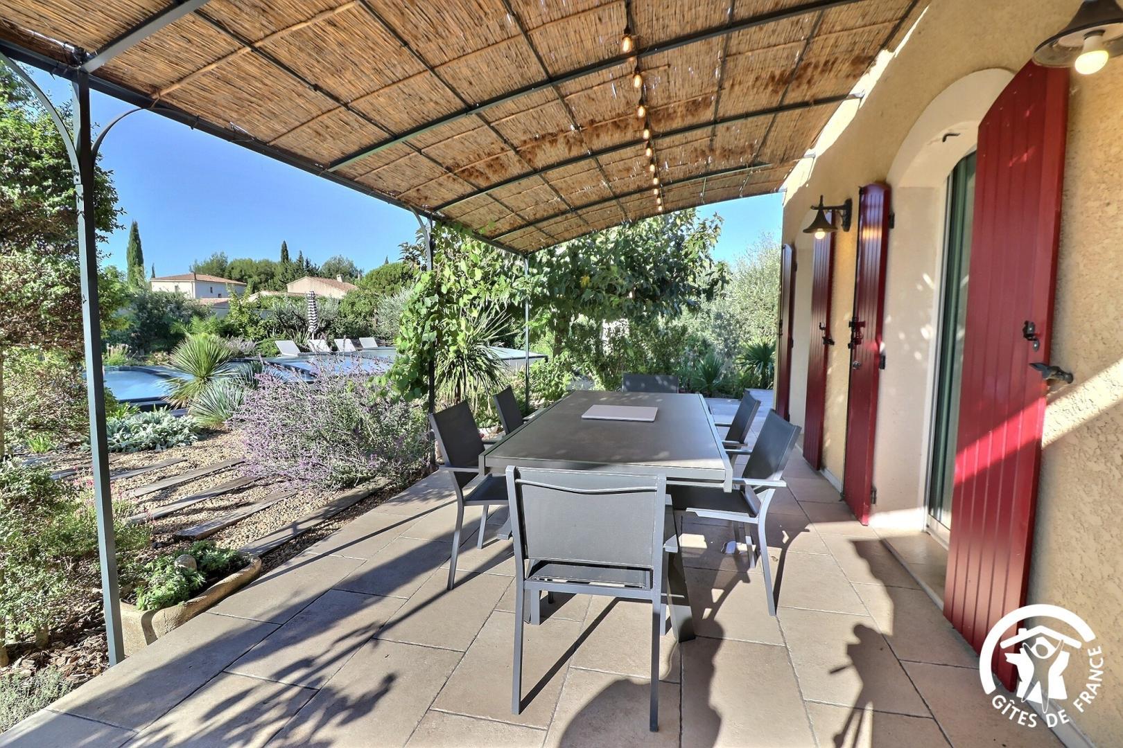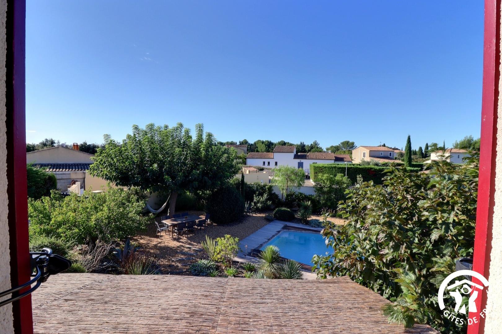 Il dispose d’un jardin paysagé de 1000m² avec deux terrasses, une au sud et une à l’ouest et d’une piscine 10x4.5 avec abri télescopique permettant de maintenir la chaleur de la piscine (ouverte de avril à fin septembre selon la météo - l’abri doit être fermé en cas de vent ce qui n’empêche pas de se baigner dessous).
