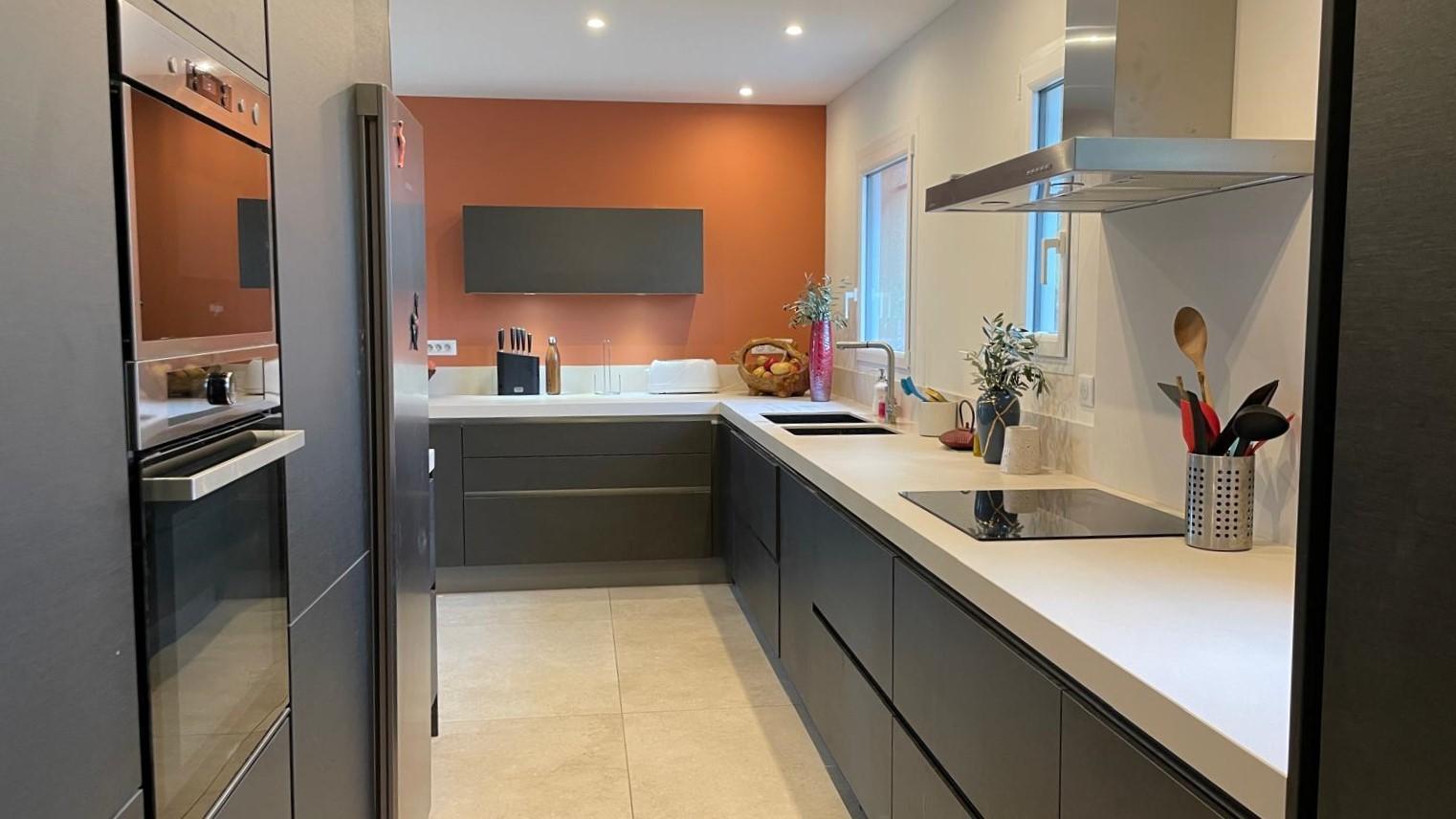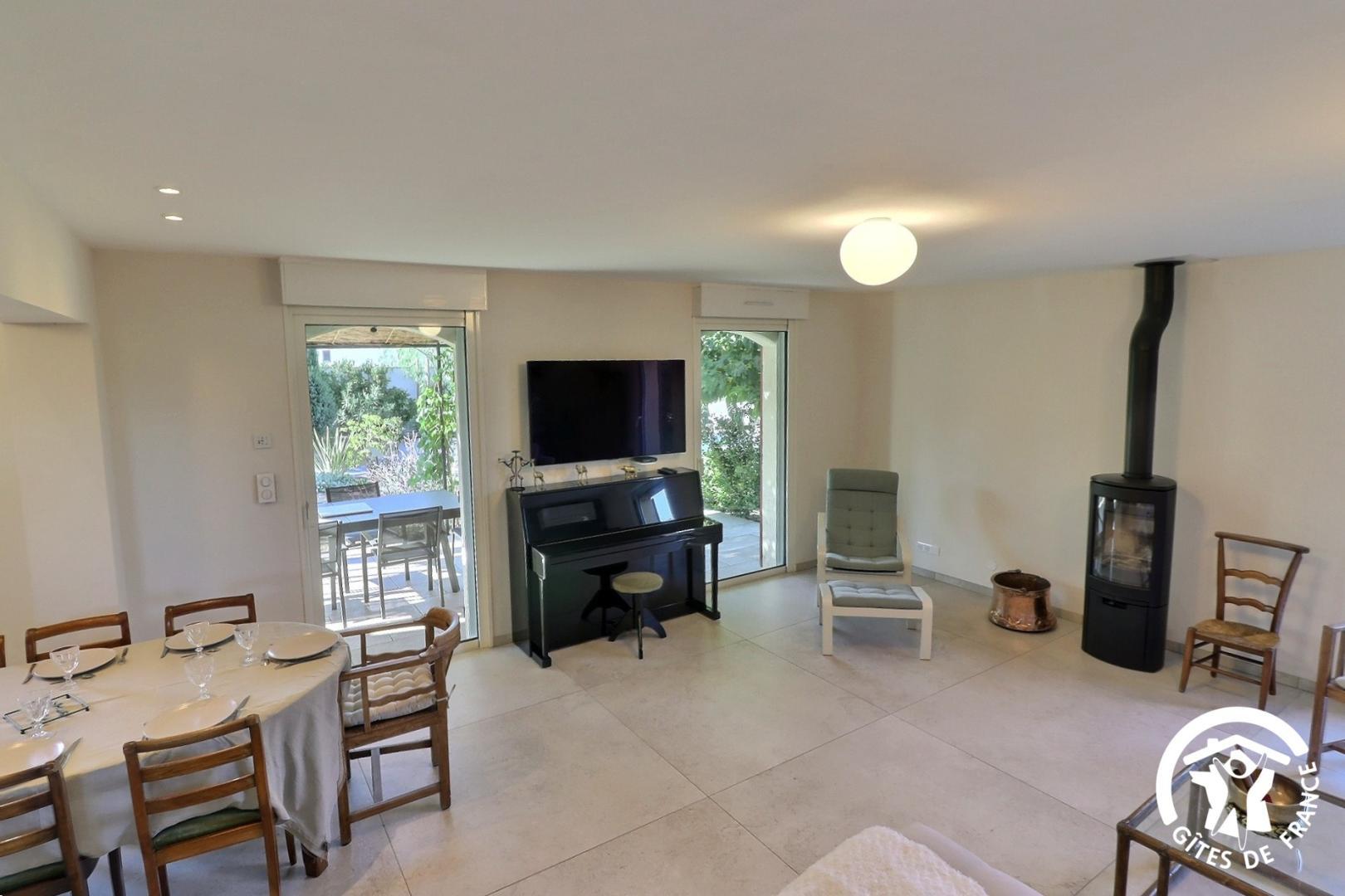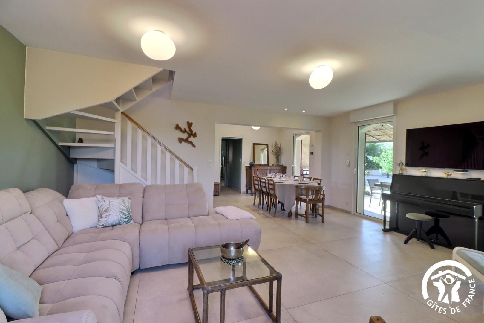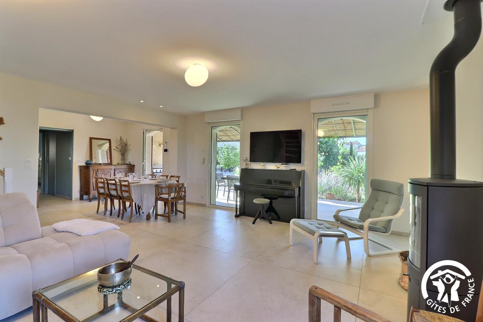 – une cuisiné équipée avec four, plaque induction, hotte aspirante et réfrigérateur-congélateur ouverte sur le salon avec canapé, fauteuils, TV, piano et fauteuils.