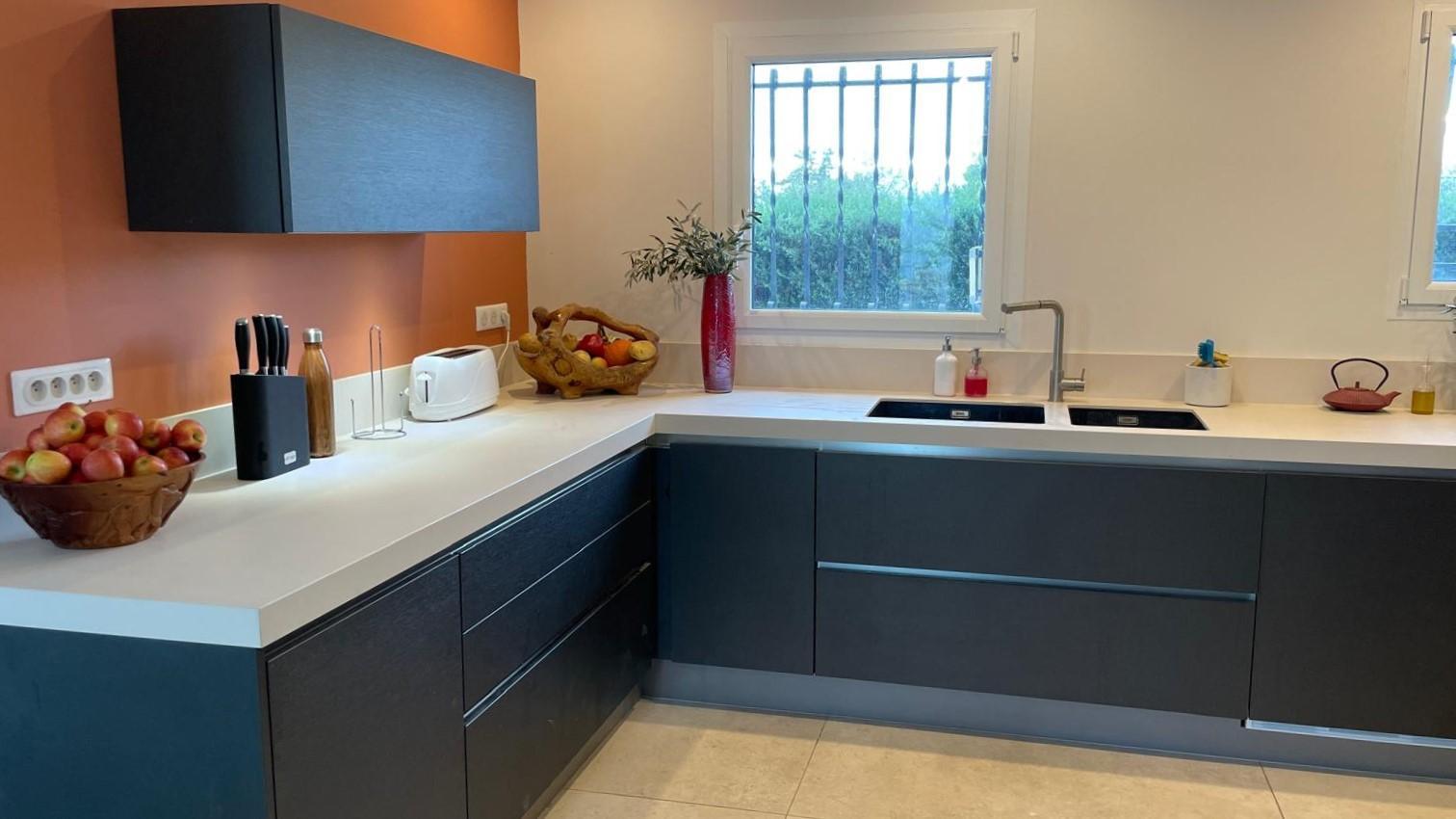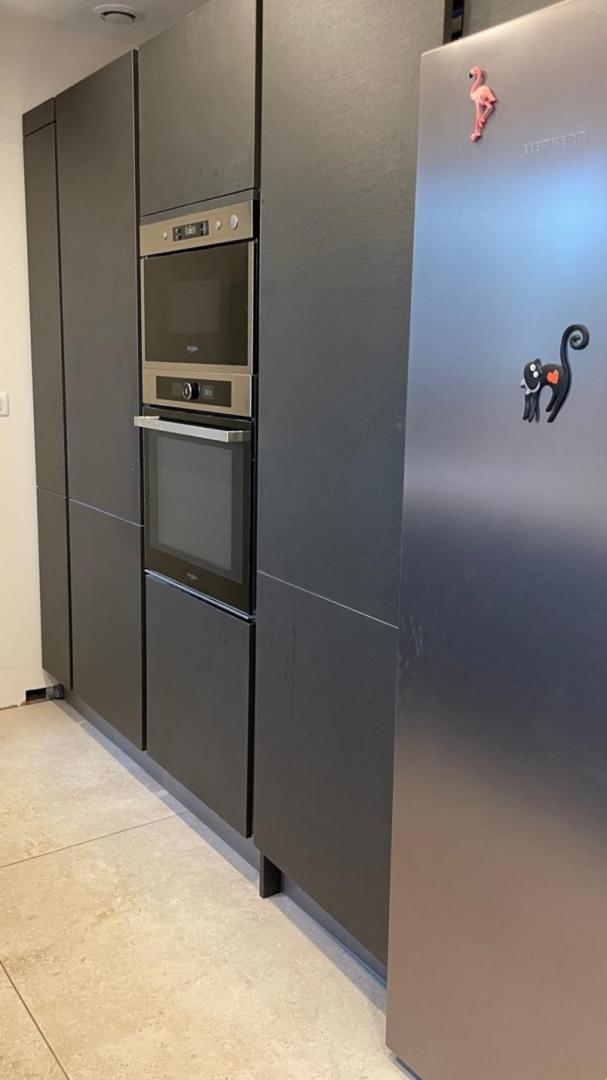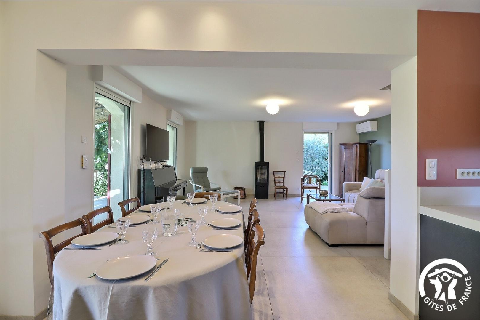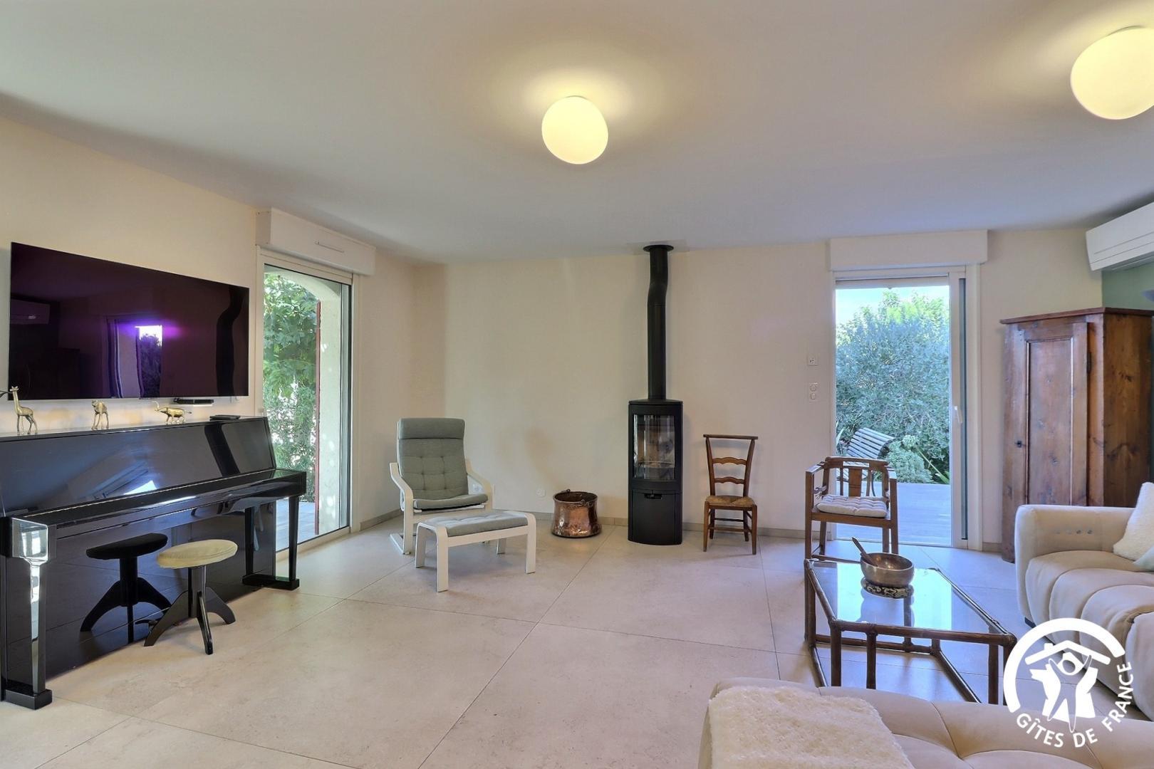 – une cuisiné équipée avec four, plaque induction, hotte aspirante et réfrigérateur-congélateur ouverte sur le salon avec canapé, fauteuils, TV, piano et fauteuils.