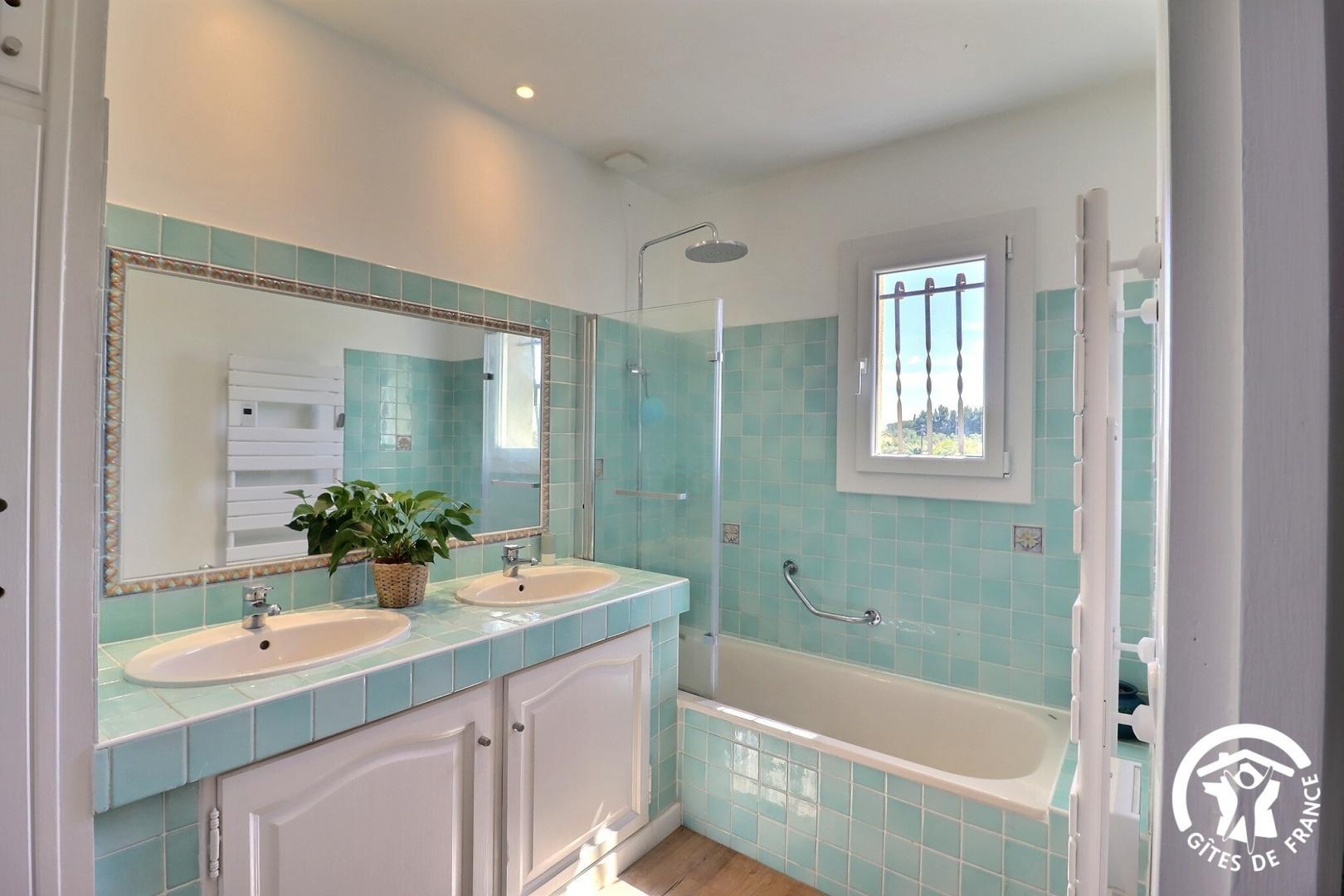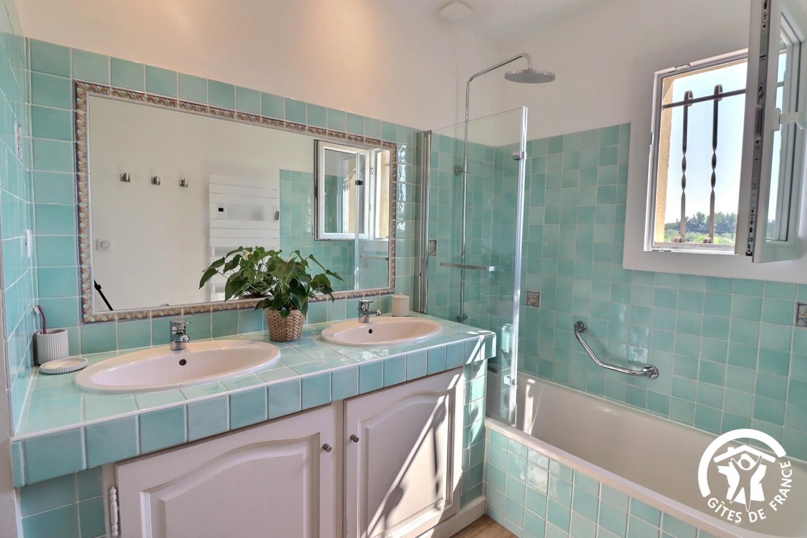 – une salle de bain avec baignoire, meuble double vaques et un sèche-serviette chauffant, rangement.