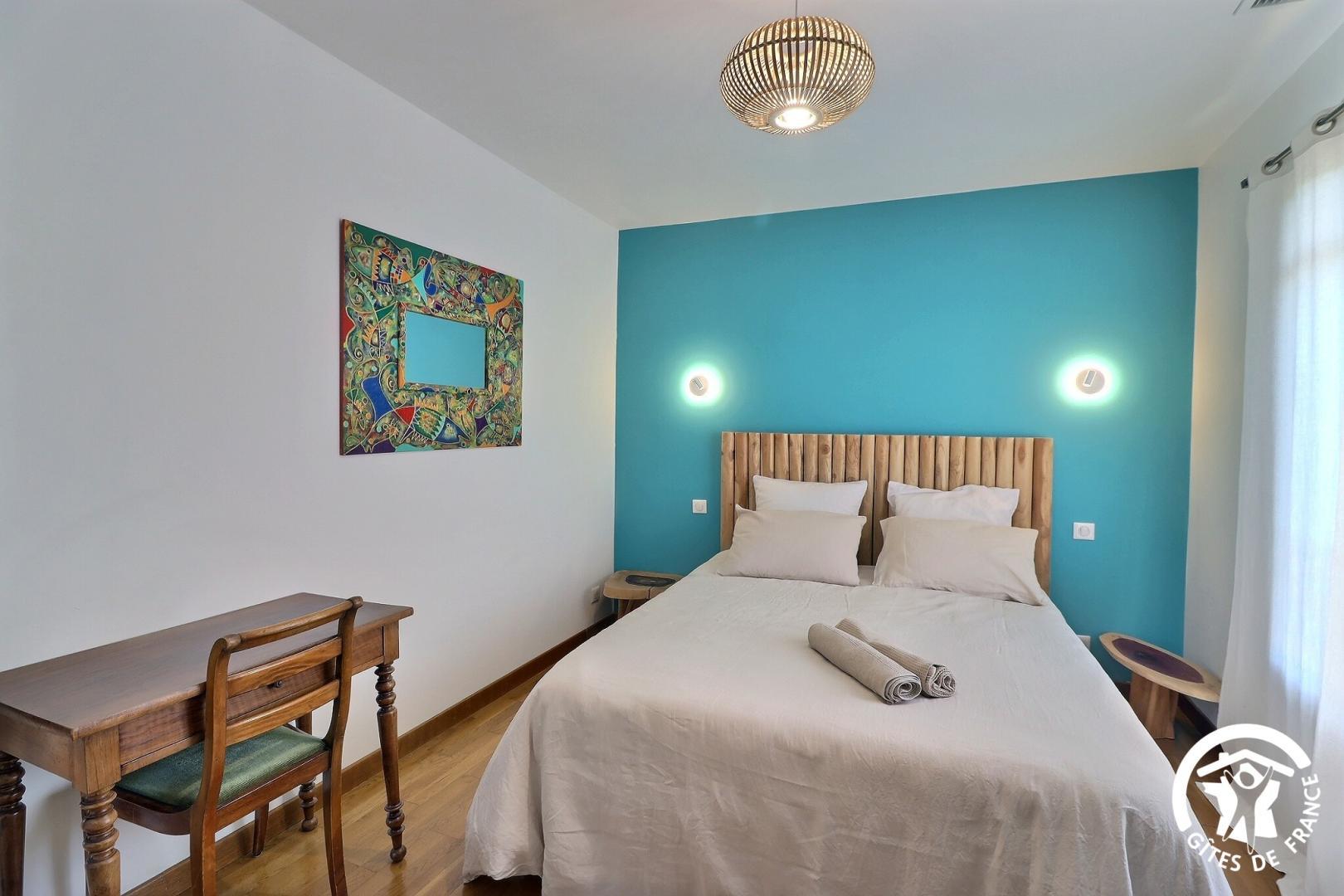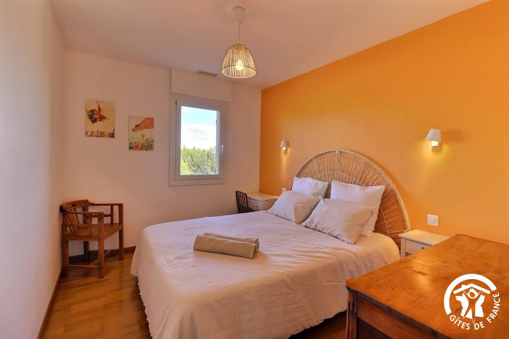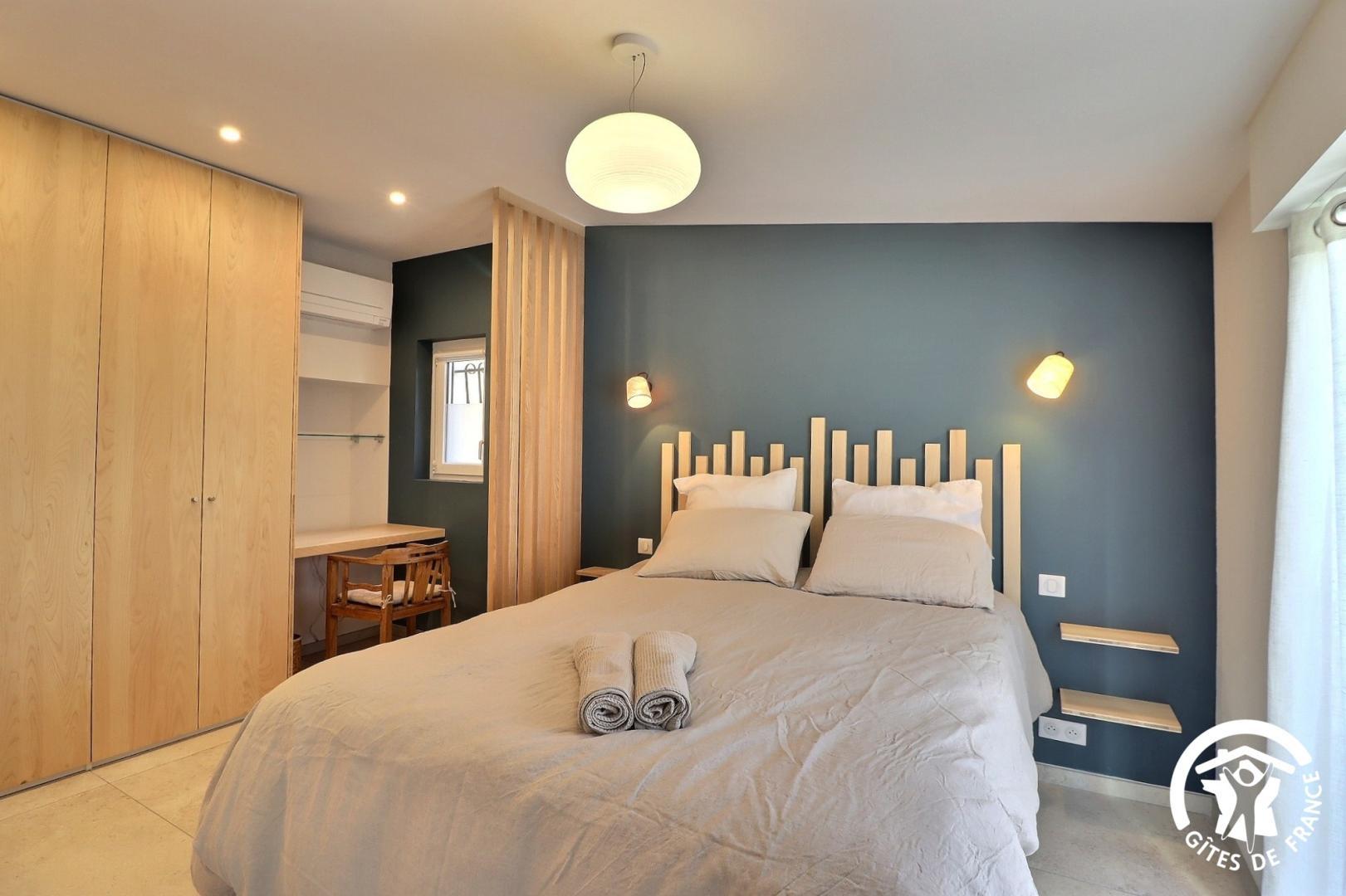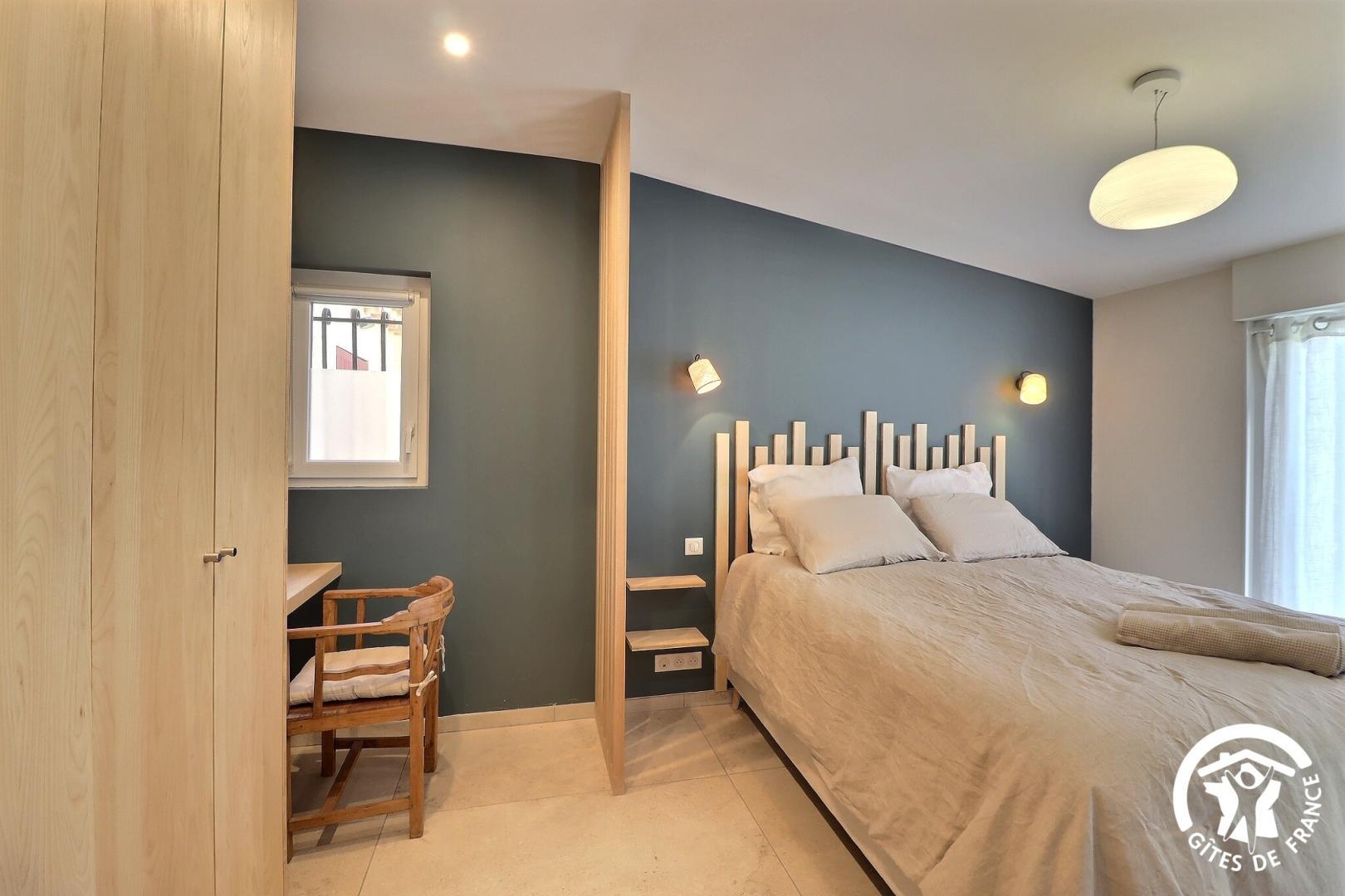 – une chambre avec un lit 160x200 (séparable en 2 lits 80x200), bureau et placard