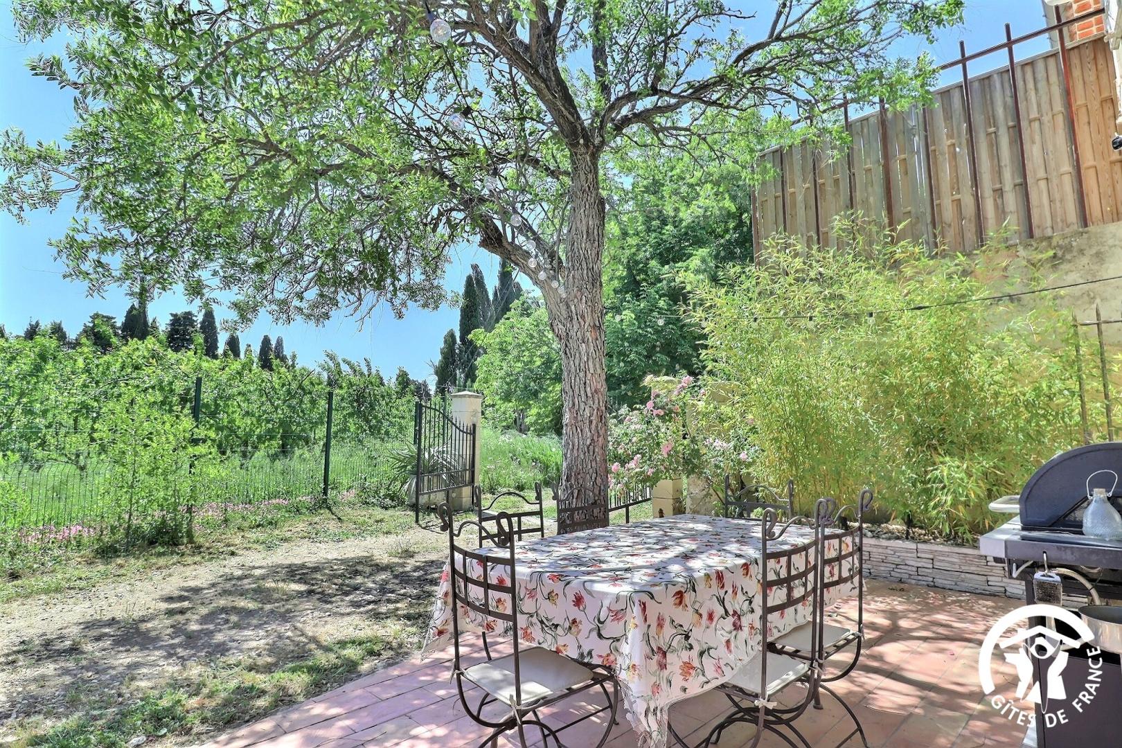 Jardin privatif clos de 400 m² environ avec portique de jeux pour enfants. Terrasse avec salon de jardin et barbecue. Piscine privative 6x4,5m, prof. 1,35m, ouverte du 01/04 au 01/10.