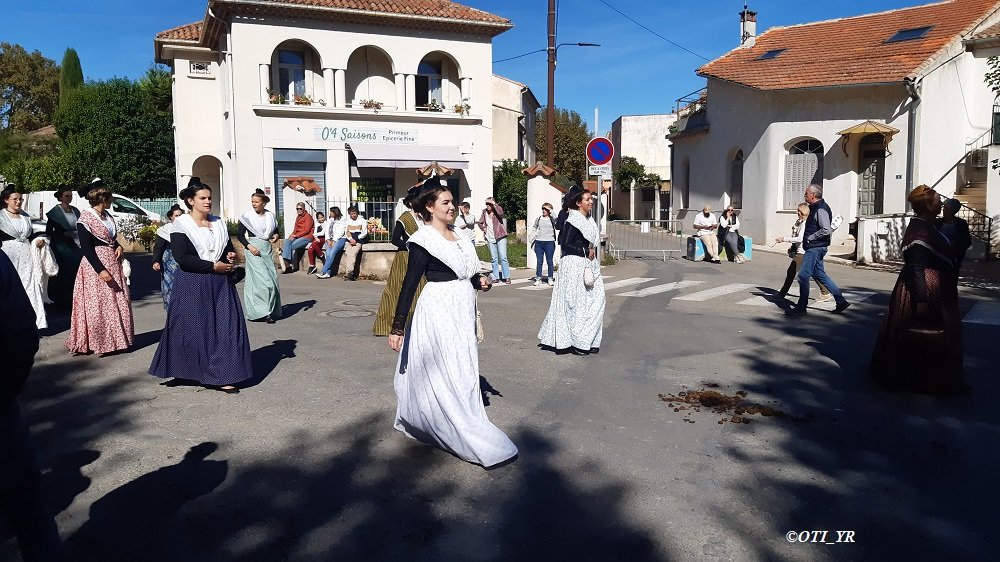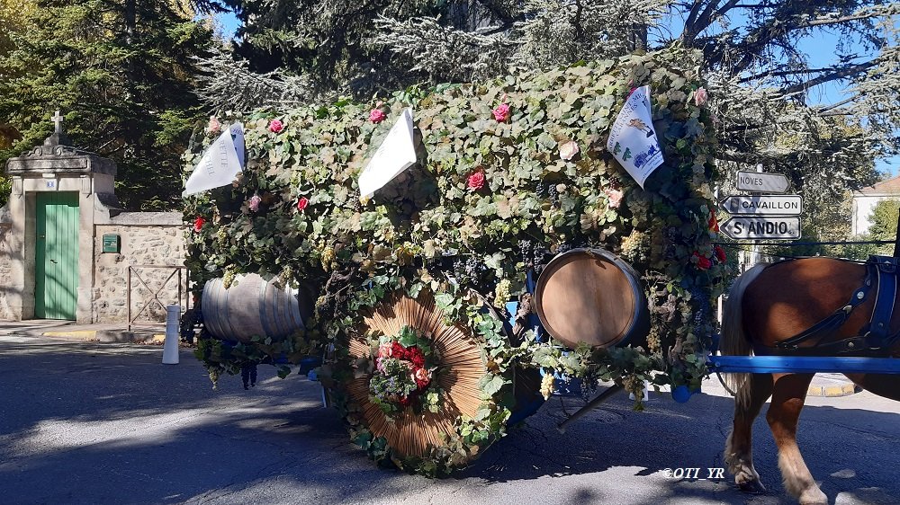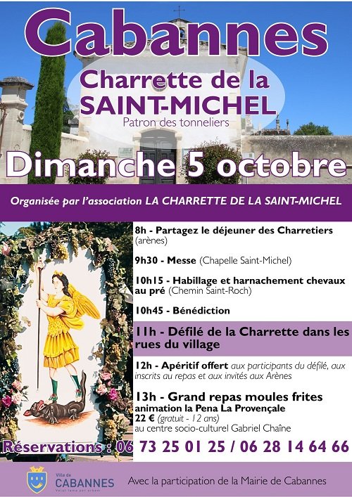 Au fil du temps, la célébration s’est enrichie d’un cortège devenu emblématique : la Charrette de la Saint-Michel, charrette « ramée » tirée par des chevaux lourds, entourée de groupes en costume. Dernière charrette de la saison, elle se distingue par sa parure de sarments et grappes… et surtout par ses tonneaux, rappelant le patronage de Saint-Michel sur les tonneliers : un trait identitaire bien vivant à Cabannes.